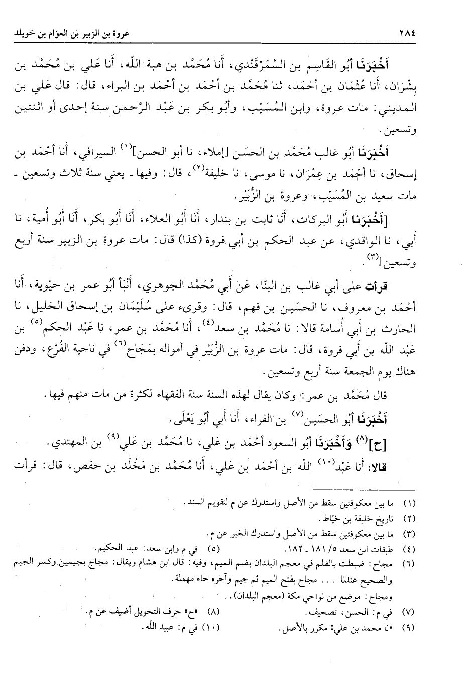 أخبرنا أبو القاسم بن السمرقندي أنا محمد بن هبة الله أنا علي بن محمد بن بشران أنا عثمان بن أحمد ثنا محمد بن أحمد بن أحمد بن البراء قال قال علي بن المديني مات عروة وابن المسيب وأبو بكر بن عبد الرحمن سنة إحدى أو اثنتين وتسعين أخبرنا أبو غالب محمد بن الحسن إملاء نا أبو الحسن (1) السيرافي أنا أحمد بن إسحاق نا أحمد بن عمران نا موسى نا خليفة (2) قال وفيها يعني سنة ثلاث وتسعين مات سعيد بن المسيب وعروة بن الزبير أخبرنا أبو البركات أنا ثابت بن بندار أنا أبو العلاء أنا أبو بكر أنا أبو أمية نا أبي نا الواقدي عن عبد الحكيم بن أبي فروة كذا قال مات عروة بن الزبير سنة أربع وتسعين (3) قرأت على أبي غالب بن البنا عن أبي محمد الجوهري أنبأ أبو عمر بن حيوية أنا أحمد بن معروف نا الحسين بن فهم قال وقرئ على سليمان بن إسحاق الخليل أنا الحارث بن أبي أسامة قالا نا محمد بن سعد (4) أنا محمد بن عمر نا عبد الحكم (5) بن عبد الله بن أبي فروة قال مات عروة بن الزبير في أمواله بمجاح (6) في ناحية الفرع ودفن هناك يوم الجمعة سنة أربع وتسعين قال محمد بن عمر وكان يقال لهذه السنة سنة الفقهاء لكثرة من مات منهم فيها أخبرنا أبو الحسين (7) بن الفراء أنا أبي أبو يعلى ح (8) وأخبرنا أبو السعود أحمد بن علي نا محمد بن علي (9) بن المهتدي قالا أنا عبد (10) الله بن أحمد بن علي أنا محمد بن مخلد بن حفص قال قرأت