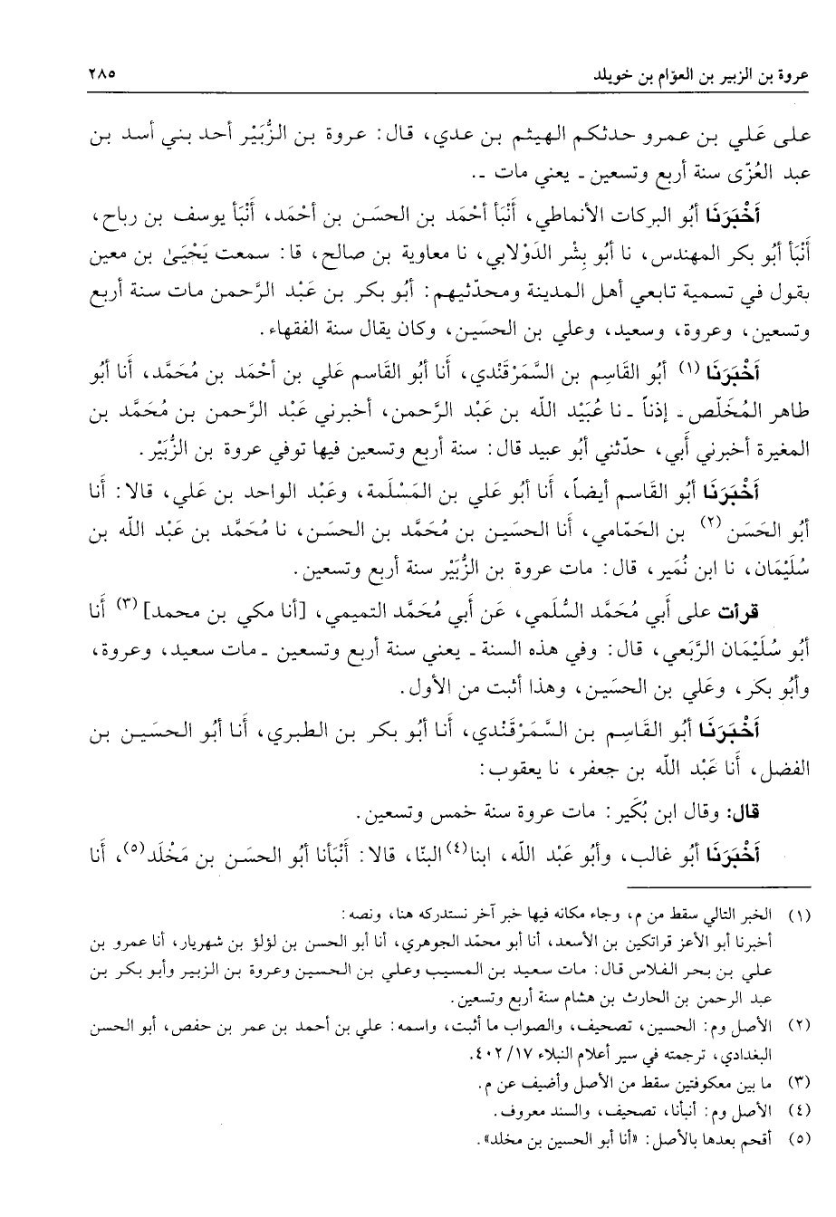 على علي بن عمرو حدثكم الهيثم بن عدي قال عروة بن الزبير أحد بني أسد بن عبد العزى سنة أربع وتسعين يعني مات أخبرنا أبو البركات الأنماطي أنبأ أحمد بن الحسن بن أحمد أنبأ يوسف بن رباح أنبأ أبو بكر المهندس نا أبو بشر الدولابي نا معاوية بن صالح قال سمعت يحيى بن معين يقول في تسمية تابعي أهل المدينة ومحدثيهم أبو بكر بن عبد الرحمن مات سنة أربع وتسعين وعروة وسعيد وعلي بن الحسين وكان يقال سنة الفقهاء أخبرنا (1) أبو القاسم بن السمرقندي أنا أبو القاسم علي بن أحمد بن محمد أنا أبو طاهر المخلص إذنا أنا عبيد الله بن عبد الرحمن أخبرني عبد الرحمن بن محمد بن المغيرة أخبرني أبي حدثني أبو عبيد قال سنة أربع وتسيعن فيها توفي عروة بن الزبير أخبرنا أبو القاسم أيضا أنا أبو علي بن المسلمة وعبد الواحد بن علي قالا أنا أبو الحسن (2) بن الحمامي أنا الحسين بن محمد بن الحسن نا محمد بن عبد الله بن سليمان نا ابن نمير قال مات عروة بن الزبير سنة أربع وتسعين قرأت على أبي محمد السلمي عن أبي محمد التميمي أنا مكي بن محمد (3) أنا أبو سليمان الربعي قال وفي هذه السنة يعني سنة أربع وتسعين مات سعيد وعروة وأبو بكر وعلي بن الحسين وهذا أثبت من الأول أخبرنا أبو القاسم بن السمرقندي أنا أبو بكر بن الطبري أنا أبو الحسين بن الفضل أنا عبد الله بن جعفر نا يعقوب قال وقال ابن بكير مات عروة سنة خمس وتسعين أخبرنا أبو غالب وأبو عبد الله ابنا (4) البنا قالا أنبأنا أبو الحسن بن مخلد (5) أنا