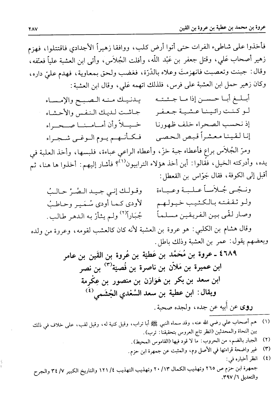(4) انظر أخباره في: جمهرة ابن حزم ص 265 وتهذيب الكمال 13 / 20 وتهذيب التهذيب 4 / 121 والتاريخ الكبير 7 / 34 والجرح والتعديل 6 / 397