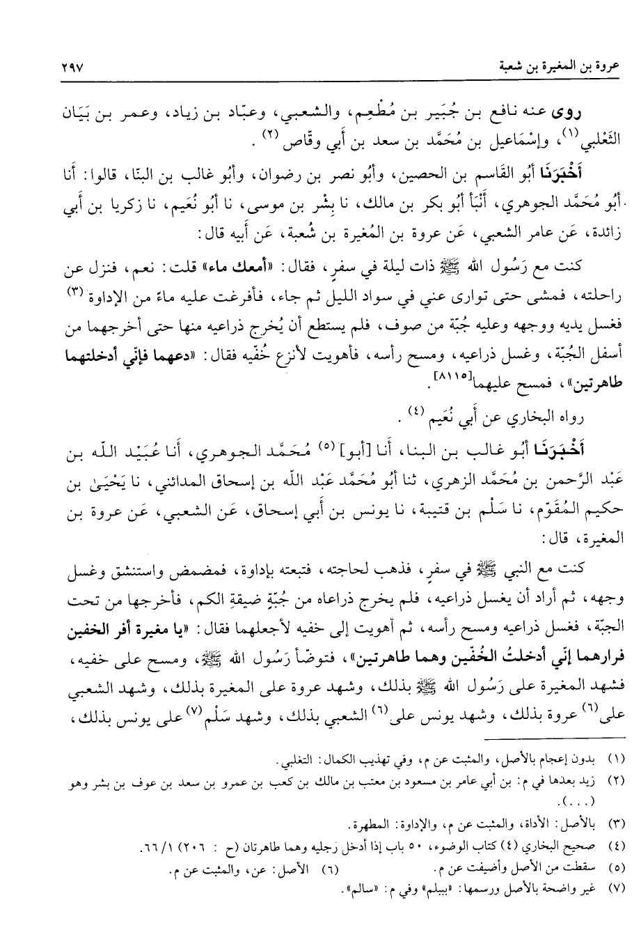 [8115] رواه البخاري عن أبي نعيم (4) أخبرنا أبو غالب بن البنا أنا أبو (5) محمد الجوهري أنا عبيد الله بن عبد الرحمن بن محمد الزهري ثنا أبو محمد عبد الله بن إسحاق المدائني نا يحيى بن حكيم المقوم نا سلم بن قتيبة نا يونس بن أبي إسحاق عن الشعبي عن عروة بن المغيرة قال كنت مع النبي (صلى الله عليه وسلم) في سفر فذهب لحاجته فتبعته بإداوة فمضمض واستنشق وغسل وجهه ثم أراد أن يغسل ذراعيه فلم يخرج ذراعاه من جبة ضيقة الكم فأخرجها من تحت الجبة فغسل ذراعيه ومسح رأسه ثم أهويت إلى خفيه لأجعلهما فقال يا مغيرة أفر الخفين فرارهما إني أدخلت الخفين وهما طاهرتين فتوضأ رسول الله (صلى الله عليه وسلم) ومسح على خفيه فشهد المغيرة على رسول الله (صلى الله عليه وسلم) بذلك وشهد عروة على المغيرة بذلك وشهد الشعبي على (6) عروة بذلك وشهد يونس على الشعبي بذلك وشهد سلم (7) على يونس بذلك