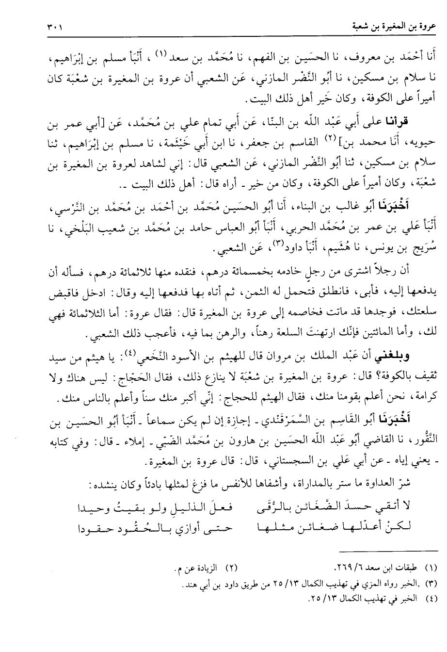 أنا أحمد بن معروف نا الحسين بن الفهم نا محمد بن سعد (1) أنبأ مسلم بن إبراهيم نا سلام بن مسكين نا أبو النضر المازني عن الشعبي أن عروة بن المغيرة بن شعبة كان أميرا على الكوفة وكان خير أهل ذلك البيت قرأنا على أبي عبد الله بن البنا عن أبي تمام علي بن محمد عن أبي عمر بن حيوية أنا محمد بن (2) القاسم بن جعفر نا ابن أبي خيثمة نا مسلم بن إبراهيم ثنا سلام بن مسكين ثنا أبو النضر المازني عن الشعبي قال إني لشاهد لعروة بن المغيرة بن شعبة وكان أميرا على الكوفة وكان من خير أراه قال أهل ذلك البيت أخبرنا أبو غالب بن البنا أنا أبو الحسين محمد بن أحمد بن محمد بن النرسي أنبأ علي بن عمر بن محمد الحربي أنبأ أبو العباس حامد بن محمد بن شعيب البلخي نا سريج بن يونس نا هشيم أنبأ داود (3) عن الشعبي أن رجلا اشترى من رجل خادمه بخمسما فنقده منها ثلاثمائة درهم فسأله أن يدفعها إليه فأبى فانطلق فتحمل له الثمن ثم أتاه بها فدفعها إليه وقال ادخل فاقبض سلعتك فوجدها قد ماتت فخاصمه إلى عروة بن المغيرة قال فقال عروة أما الثلاثمائة فهي لك وأما المائتين فإنك ارتهنت السلعة رهنا والرهن بما فيه فأعجب ذلك الشعبي وبلغني أن عبد الملك بن مروان قال للهيثم بن الأسود النخعي (4) يا هيثم من سيد ثقيف بالكوفة قال عروة بن المغيرة بن شعبة لا ينازع ذلك فقال الحجاج ليس هناك ولا كرامة نحن أعلم بقومنا منك فقال الهيثم للحجاج إني أكبر منك سنا وأعلم بالناس منك أخبرنا أبو القاسم بن السمرقندي إجازة إن لم يكن سماعا أنبأ أبو الحسين بن النقور أنا القاضي أبو عبد الله الحسين بن هارون بن محمد الضبي إملاء قال وفي كتابه يعني إياه عن أبي علي بن السجستاني قال عروة بن المغيرة شر العداوة ما ستر بالمداراة وأشفاها للأنفس ما فزغ لمثلها بادئا وكان ينشد هـ * لا أتقي حسد الضغائن بالرقى * فعل الذليل ولو بقيت وحيدا لكن أعدلها ضغائن مثلها * حتى أوازي بالحقود حقودا