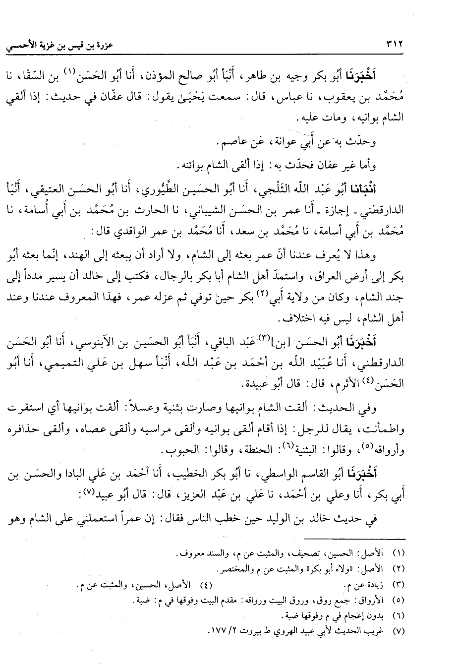 أخبرنا أبو بكر وجيه بن طاهر أنبأ أبو صالح المؤذن أنا أبو الحسن (1) بن السقا نا محمد بن يعقوب نا عباس قال سمعت يحيى يقول قال عفان في حديث إذا ألقي الشام بوانيه ومات عليه وحدث به عن أبي عوانة عن عاصم وأما غير عفان فحدث به إذا ألقى الشام بوائنه أنبأنا أبو عبد الله الثلجي أنا أبو الحسين الطيوري أنا أبو الحسن العتيقي أنبأ الدارقطني إجازة أنا عمر بن الحسن الشيباني نا الحارث بن محمد بن أبي أسامة نا محمد بن أبي أسامة نا محمد بن سعد أنا محمد بن عمر الواقدي قال وهذا لا يعرف عندنا أن عمر بعثه إلى الشام ولا أراد أن يبعثه إلى الهند إنما بعثه أبو بكر إلى أرض العراق واستمد أهل الشام أبا بكر بالرجال فكتب إلى خالد أن يسير مددا إلى جند الشام وكان من ولاية أبي بكر حين توفي ثم عزله عمر فهذا المعروف عندنا وعند أهل الشام ليس فيه اختلاف أخبرنا أبو الحسن بن (3) عبد الباقي أنبأ أبو الحسين بن الآبنوسي أنا أبو الحسن الدارقطني أنا عبيد الله بن أحمد بن عبد الله أنبأ سهل بن علي التميمي أنا أبو الحسن (4) الأثرم قال قال أبو عبيدة وفي الحديث ألقت الشام بوانيها وصارت بثنية وعسلا ألقت بوانيها أي أستقرت وأطمأنت يقال للرجل إذا أقام القى بوانيه وألقى مراسيه وألقى عصاه وألقى حذافره وأرواقه (5) وقالوا البثنية (6) الحنطة وقالوا الحبوب أخبرنا أبو القاسم الواسطي نا أبو بكر الخطيب أنا أحمد بن علي البادا والحسن بن أبي بكر أنا وعلي بن أحمد نا علي بن عبد العزيز قال قال أبو عبيد (7) في حديث خالد بن الوليد حين خطب الناس فقال إن عمرا استعملني على الشام وهو