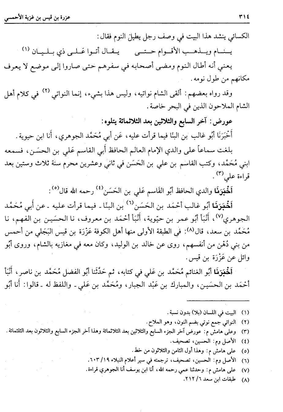 الكسائي ينشد هذا البيت وفي وصف رجل يطيل النوم فقال * ينام ويذهب الأقوام حتى * يقال أتوا على ذي بليان * (1) يعني أنه أطال النوم ومضى أصحابه في سفرهم حتى صاروا إلى موضع لايعرف مكانهم من طول نومه وقد رواه بعضهم ألقى الشام نواتيه وليس هذا بشئ إنما النواتي (2) في كلام أهل الشام الملاحون الذي في البحر خاصة عورض آخر السابع والثلاثين بعد الثلاثمائة يتلوه أخبرنا أبو غالب بن البنا فيما قرأت عليه عن أبي محمد الجوهري أنا أبن حيوية بلغت سماعا على والدي الإمام العالم الحافظ أبي القاسم علي بن الحسن فسمعه ابني محمد وكتب القاسم بن علي بن الحسن في ثاني وعشرين محرم سنة ثلاث وستين بعد قراءة علي (3) أخبرنا والدي الحافظ أبو القاسم علي بن الحسن (4) رحمه الله قال (5) أخبرنا أبو غالب أحمد بن الحسن بن البنا (6) فيما قرأت عليه عن أبي محمد الجوهري (7) أنبأ أبو عمر بن حيوية أنبأ أحمد بن معروف نا الحسين بن الفهم نا محمد بن سعد قال (8) في الطبقة الأولى منها أهل الكوفة عزرة بن قيس البجلي من أحمس من بني دهن من أنفسهم روى عن خالد بن الوليد وكان معه في مغازيه بالشام وروى أبو وائل عن عزرة بن قيس أخبرنا أبو الغنائم محمد بن علي في كتابه ثم حدثنا أبو الفضل محمد بن ناصر أنبأ أحمد بن الحسين والمبارك بن عبد الجبار ومحمد بن علي واللفظ له قالوا أنا أبو