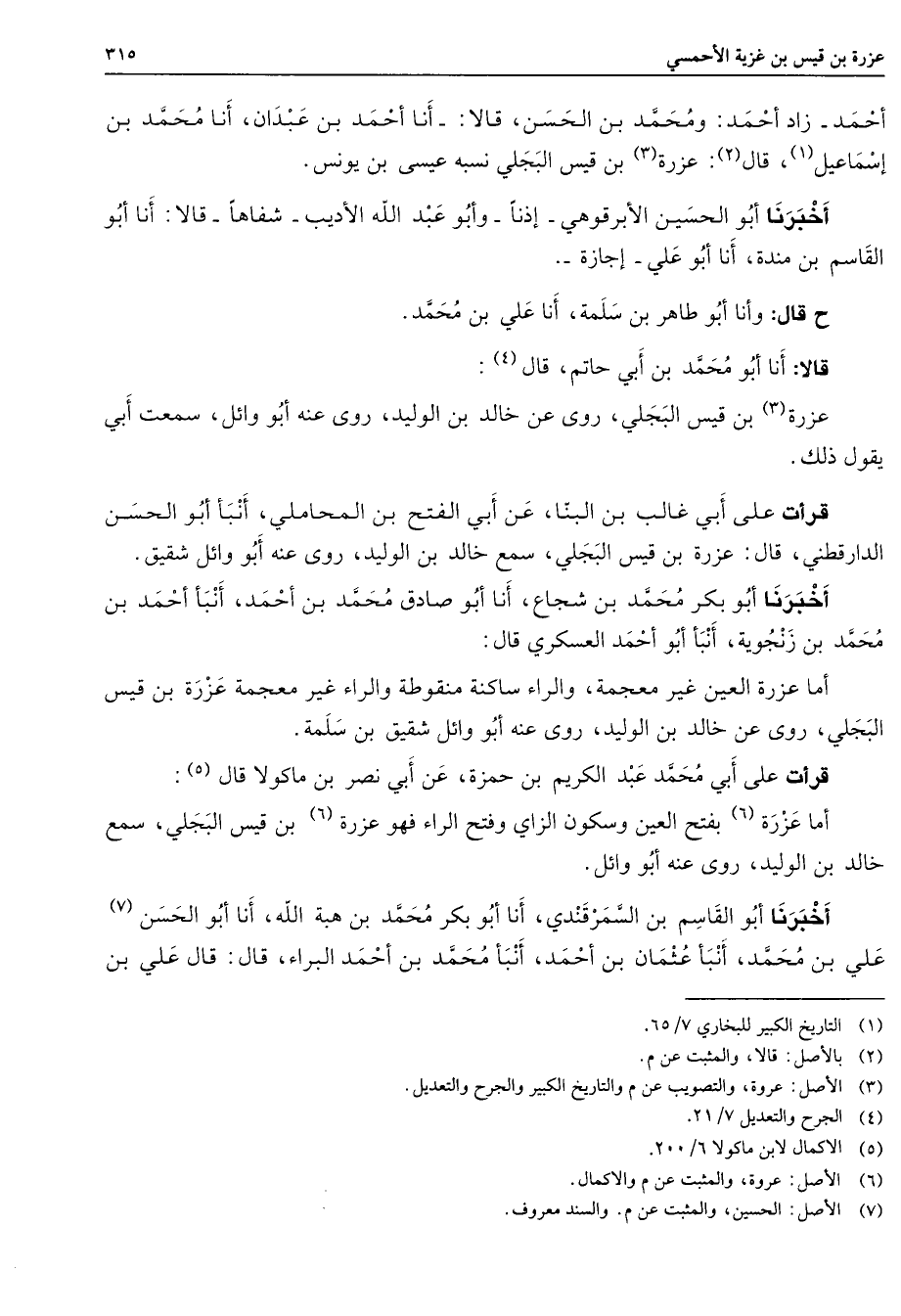 أحمد زاد أحمد ومحمد بن الحسن قالا أنا أحمد بن عبدان أنا محمد بن إسماعيل (1) قال (2) عزرة (3) بن قيس البجلي نسبة عيسى بن يونس أخبرنا أبو الحسين الأبرقوهي إذنا وأبو عبد الله الأديب شفاها قالا أنا أبو القاسم بن مندة أنا أبو علي إجازة ح قال وأنا أبو طاهر بن سلمة أنا علي بن محمد قالا أنا أبو محمد بن أبي حاتم قال (4) عزرة بن قيس البجلي روى عن خالد بن الوليد روى عنه أبو وائل سمعت أبي يقول ذلك قرأت على أبي غالب بن البنا عن أبي الفتح بن المحاملي أنبأ أبو الحسن الدارقطني قال عزرة بن قيس البجلي سمع خالد بن الوليد روى عنه أبو وائل شقيق أخبرنا أبو بكر محمد بن شجاع أنا أبو صادق محمد بن أحمد أنبأ أحمد بن محمد بن زنجوية أنبأ أبو أحمد العسكري قال أما عزرة العين غير معجمة والراء ساكنة منقوطة والراء غير معجمة عزرة بن قيس البجلي روى عن خالد بن الوليد روى عنه أبو وائل شقيق بن سلمة قرأت على أبي محمد عبد الكريم بن حمزة عن أبي نصر بن ماكولا قال (5) أما عزرة بفتح العين وسكون الزاي وفتح الراء فهو عزرة (6) بن قيس البجلي سمع خالد بن الوليد روى عنه أبو وائل أخبرنا أبو القاسم بن السمرقندي أنا أبو بكر محمد بن هبة الله أنا أبو الحسن (7) علي بن محمد أنبأ عثمان بن أحمد أنبأ محمد بن أحمد بن البراء قال قال علي بن
