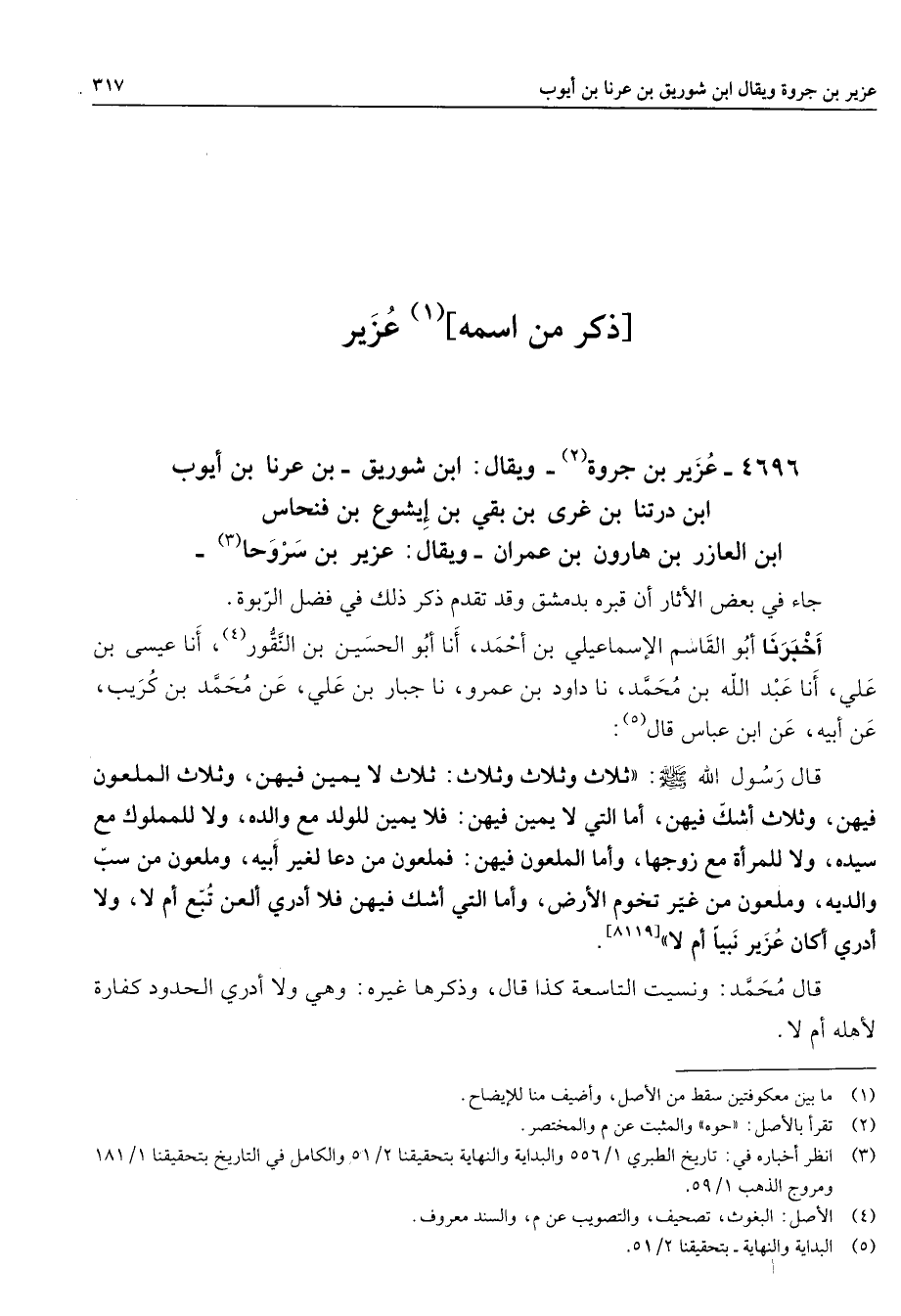 4696 - عزير بن جروة (2) ويقال ابن شوريق بن عرنا بن أيوب بن درتنا بن غرى بن بقي بن إيشوع بن فنحاس بن العازر بن هارون بن عمران ويقال عزير بن سروحا (3) جاء في بعض الأثار أن قبره بدمشق وقد تقدم ذلك في فضل الربوة أخبرنا أبو القاسم الإسماعيلي بن أحمد أنا أبو الحسين بن النقور (4) أنا عيسى بن علي أنا عبد الله بن محمد نا داود بن عمرو نا جبار بن علي عن محمد بن كريب عن أبيه عن ابن عباس قال (5) قال رسول الله (صلى الله عليه وسلم) ثلاث وثلاث وثلاث ثلاث لا يمين فيهن وثلاث الملعون فيهن وثلاث أشك فيهن أما التي لا يمين فيهن فلا يمين للولد مع والده ولا للمملوك مع سيده ولا للمرأة مع زوجها وأما الملعون فيهن فملعون من دعا لغير أبيه وملعون من سب والديه وملعون من غير تخوم الأرض وأما التي أشك فيهن فلا أدري ألعن تبع أم لا ولا أدري أكان عزير نبيا أم لا