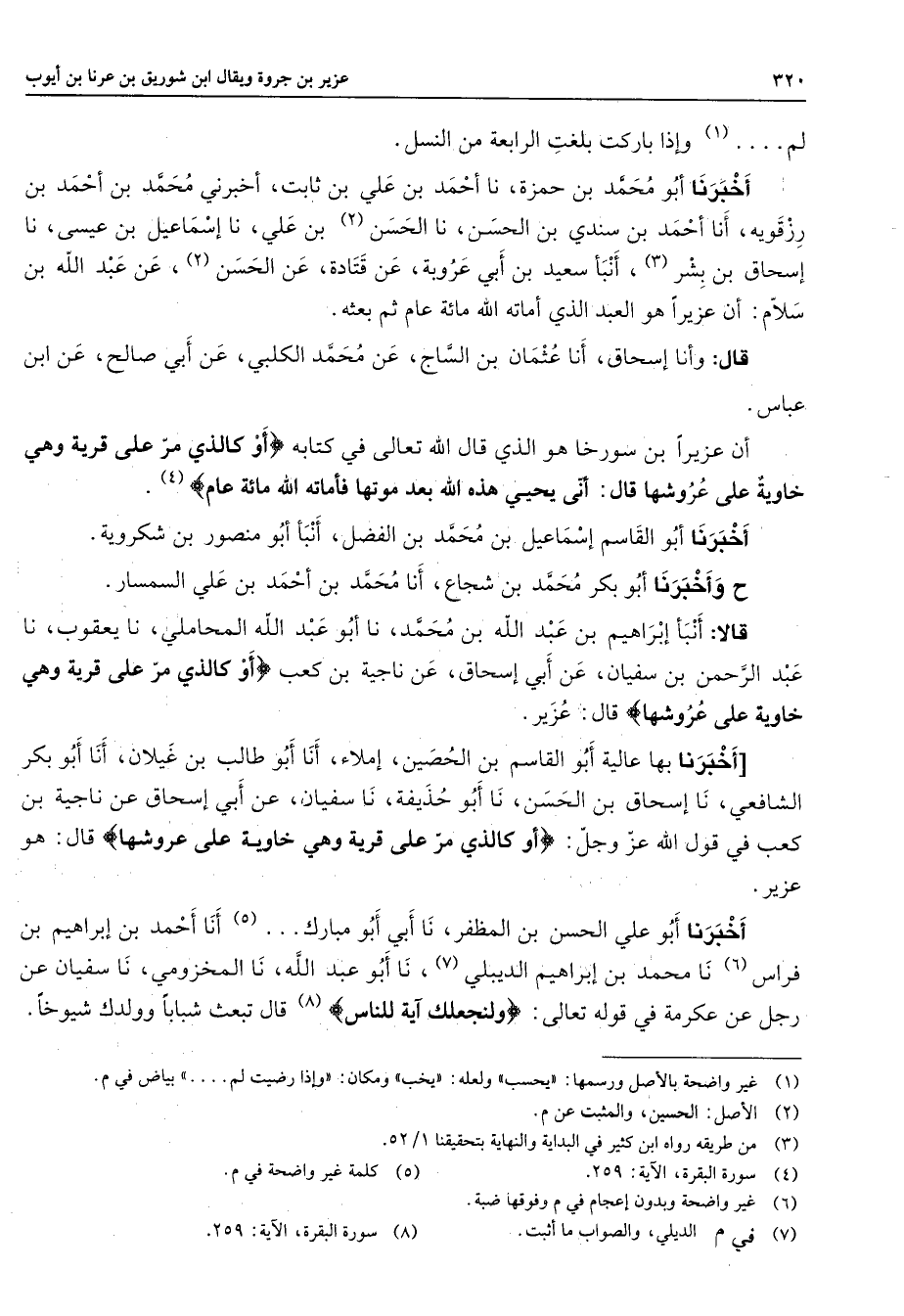 لم (1) وإذا باركت بلغت الرابعة من النسل أخبرنا أبو محمد بن حمزة أنا أحمد بن علي بن ثابت أخبرني محمد بن أحمد بن رزقويه أنا أحمد بن سندي بن الحسن نا الحسن (2) بن علي نا إسماعيل بن عيسى نا إسحاق بن بشر (2) أنبأ سعيد بن أبي عروبة عن قتادة عن الحسن (2) عن عبد الله بن سلام أن عزيرا هو العبد الذي أماته الله مائة عام ثم بعثه قال وأنا إسحاق أنا عثمان بن الساج عن محمد الكلبي عن أبي صالح عن ابن عباس أن عزيرا بن سورخا هو الذي قال الله تعالى في كتابه " أو كالذي مر على قرية وهي خاوية على عروشها قال أنى يحيي هذه الله بعد موتها فأماته الله مائة عام " (4) أخبرنا أبو القاسم إسماعيل بن محمد بن الفضل أنبأ أبو منصور بن شكروية أخبرنا أبو بكر محمد بن شجاع أنا محمد بن أحمد بن علي السمسار قالا أنبأ إبراهيم بن عبد الله بن محمد نا أبو عبد الله المحاملي نا يعقوب نا عبد الرحمن بن سفيان عن أبي إسحاق عن ناجية بن كعب " أو كالذي مر على قرية وهي خاوية على عروشها " قال عزير أخبرنا بها عالية أبو القاسم بن الحصين إملاء أنا أبو طالب بن غيلان أن أبو بكر الشافعي نا إسحاق بن الحسن نا أبو حذيفة نا سفيان عن أبي إسحاق عن ناجية بن كعب في قول الله عز وجل " أو كالذي مر على قرية وهي خاوية على عروشها " قال هو عزير أخبرنا أبو علي الحسن بن المظفر نا أبي أبو مبارك (5) أنا أحمد بن إبراهيم بن فراس (6) أنا محمد بن إبراهيم الديبلي (7) أنا أبو عبد الله أنا المخزومي أنا سفيان عن رجل عن عكرمة في قوله تعالى " ولنجعلك آية للناس " (8) قال تبعث شبابا وولدك شيوخا