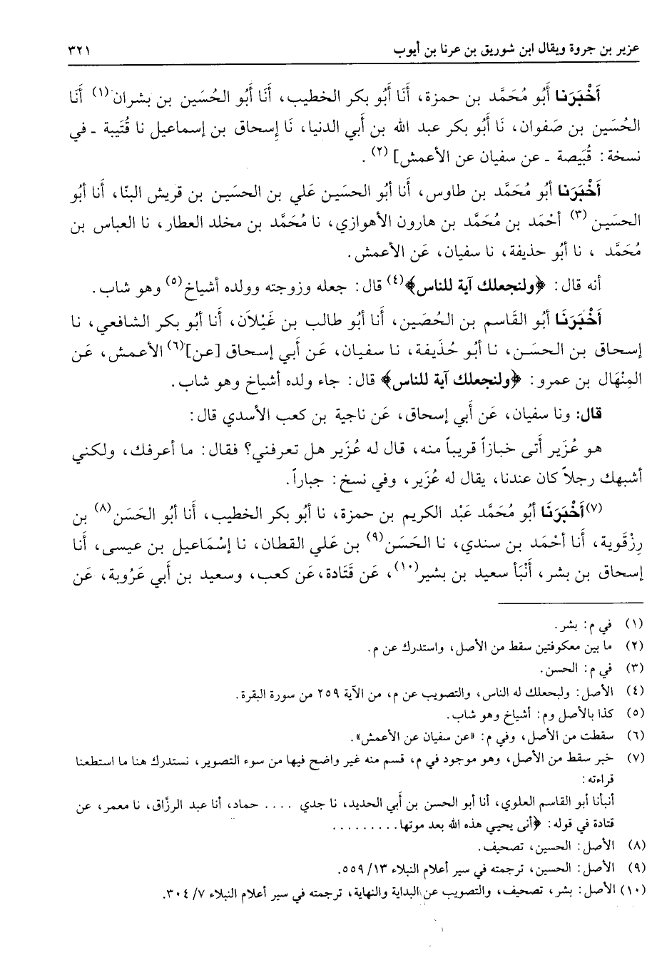 أخبرنا أبو محمد بن حمزة نا أبو بكر الخطيب نا أبو الحسين بن بشران (1) نا الحسين بن صفوان نا أبو بكر عبد الله بن أبي الدنيا نا إسحاق بن إسماعيل نا قتيبة في نسخة قبيصة عن سفيان عن الأعمش (2) أخبرنا أبو محمد بطاوس أن أبو الحسين علي بن الحسين بن قريش البنا نا أبو الحسين (3) أحمد بن محمد بن هارون الأهوازي نا محمد بن مخلد العطار نا العباس بن محمد نا أبو حذيفة نا سفيان عن الأعمش أنه قال " ولنجعلك آية للناس " (4) قال جعله وزوجته وولده أشياخ (5) وهو شاب أخبرنا أبو القاسم بن الحصين نا أبو طالب بن غيلان نا أبو بكر الشافعي أنا إسحاق بن الحسن أن أبو حذيفة أنا سفيان عن أبي إسحاق عن (5) الأعمش عن المنهال بن عمرو " ولنجعلك آية للناس " قال جاء ولده أشياخ وهو شاب قال وأنا سفيان عن أبي إسحاق عن ناجية بن كعب الأسدي قال هو عزير أتى خبازا قريبا منه قال له عزير له هل تعرفني فقال ما أعرفك ولكني أشبهك رجلا كان عندنا يقال وفي نسخ جبارا 7 () أخبرنا أبو محمد عبد الكريم بن حمزة نا أبو بكر الخطيب نا أبو الحسن (8) بن رزقوية نا أحمد بن سندي أنا الحسن (9) بن علي القطان أنا إسماعيل بن عيسى أنا إسحاق بن بشر أنبأ سعيد بن بشير (10) عن قتادة عن كعب وسعيد بن أبي عروبة عن
