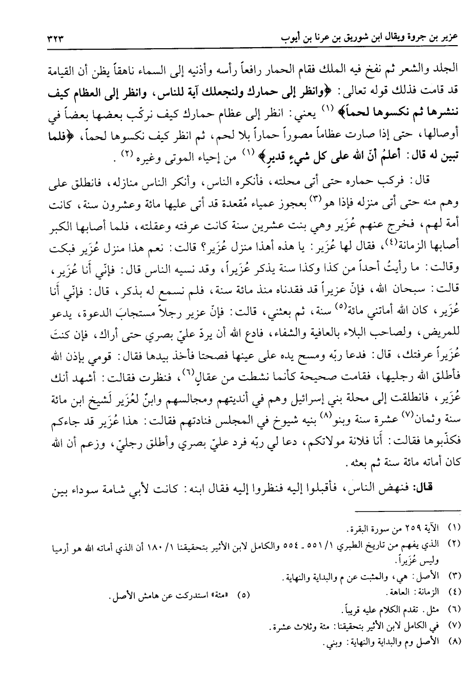 الجلد والشعر ثم نفخ فيه الملك فقام الحمار رافعا رأسه وأذنيه إلى السماء ناهقا يظن أن القيامة قد قامت فذلك قوله تعالى " وانظر إلى حمارك ولنجعلك آية للناس وانظر إلى العظام كيف ننشرها ثم نكسوها لحما " (1) يعني انظر إلى عظام حمارك كيف نركب بعضها بعضا في أوصالها حتى إذا صارت عظاما مصورا حمارا بلا لحم ثم انظر كيف نكسوها لحما " فلما تبين له قال أعلم أن الله على كل شئ قدير " (1) من إحياء الموتى وغيره (2) قال فركب حماره حتى أتى محلته فأنكره الناس وأنكر الناس منازله فانطلق على وهم منه حتى أتى منزله فإذا هو (3) بعجوز عمياء مقعدة قد أتى عليها مائة وعشرون سنة كانت أمة لهم فخرج عنهم عزير وهي بنت عشرين سنة كانت عرفته وعقلته فلما أصابها الكبر أصابها الزمانة (4) فقال لها عزير يا هذه أهذا منزل عزير قالت نعم هذا منزل عزير فبكت وقالت ما رأيت أحدا من كذا وكذا سنة يذكر عزيرا وقد نسيه الناس قال فإني أنا عزير قالت سبحان الله فإن عزيرا قد فقدناه منذ مائة سنة فلم نسمع له بذكر قال فإني أنا عزير كان الله أماتني مائة (5) سنة ثم بعثني قالت فإن عزير رجلا مستجاب الدعوة يدعو للمريض ولصاحب البلاء بالعافية والشفاء فادع الله أن يرد علي بصري حتى أراك فإن كنت عزيرا عرفتك قال فدعا ربه ومسح يده على عينها فصحتا فأخذ بيدها فقال قومي فإذن الله فأطلق الله رجليها فقامت صحيحة كأنما نشطت من عقال (6) فنظرت فقالت أشهد أنك عزير فانطلقت إلى محلة بني إسرائيل وهم في أنديتهم ومجالسهم وابن لعزير لشيخ ابن مائة سنة وثمان (7) عشرة سنة وبنو (8) بنيه شيوخ في المجلس فنادتهم فقالت هذا عزير قد جاءكم فكذبوها فقالت أنا فلانة مولاتكم دعا لي ربه فرد علي بصري وأطلق رجلي وزعم أن الله كان أماته مائة سنة ثم بعثه قال فنهض الناس فأقبلوا إليه فنظروا إليه فقال ابنه كانت لأبي شامة سوداء بين