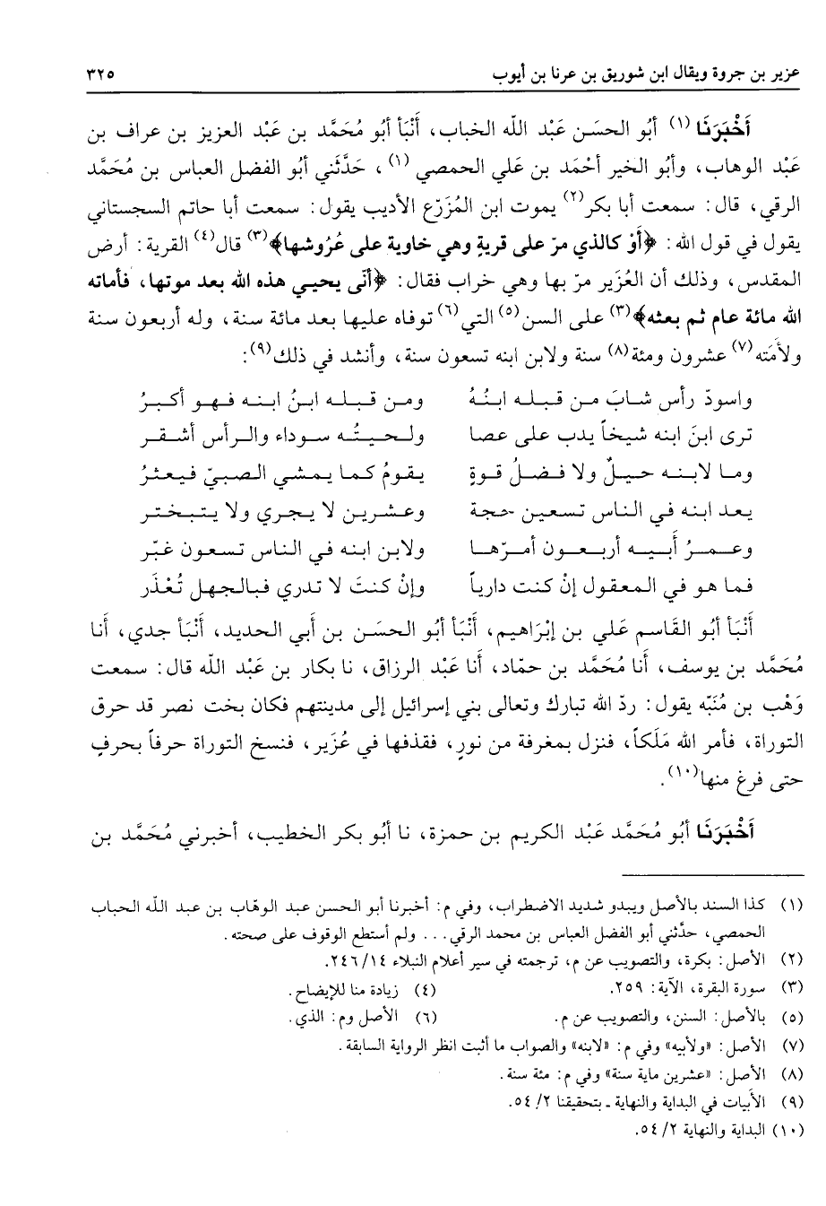 أخبرنا (1) أبو الحسن عبد الله الخباب أنبأ أبو محمد بن عبد العزيز بن عراف بن عبد الوهاب وأبو الخير أحمد بن علي الحمصي (1) حدثني أبو الفضل العباس بن محمد الرقي قال سمعت أبا بكر (2) يموت ابن المزرع الأديب يقول سمعت أبا حاتم السجستاني يقول في قول الله " أو كالذي مر على قرية وهي خاوية على عروشها " (3) قال (4) القرية أرض المقدس وذلك أن العزير مر بها وهي خراب فقال " أنى يحيي هذه الله بعد موتها فأماته الله مائة عام ثم بعثه (3) " على السن (5) التي (6) توفاه عليها بعد مائة سنة وله أربعون سنة ولأمته (7) عشرون ومئة (8) سنة ولإبن ابنه تسعون سنة وأنشد في ذلك (9) * واسود رأس شاب من قبله ابنه * ومن قبله ابن ابنه فهو أكبر ترى ابن ابنه شيخا يدب على عصا * ولحيته سوداء والرأس أشقر وما لإبنه حيل ولا فضل قوة * يقوم كما يمشي الصبي فيعثر يعد ابنه في الناس تسعين حجة * وعشرين لا يجري ولا يتبختر وعمر أبيه أربعون أمرها * ولابن ابنه في الناس تسعون غبر فما هو في المعقول إن كنت داريا * وإن كنت لا تدري فبالجهل تعذر *
