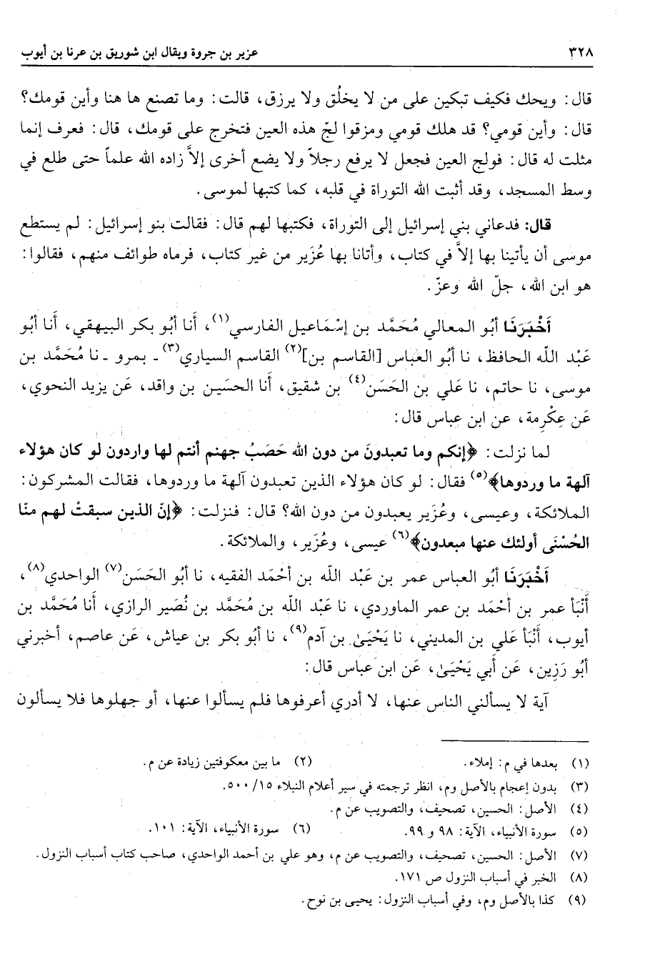 قال ويحك فكيف تبكين على من لا يخلق ولا يرزق قالت وما تصنع ها هنا وأين قومك قال وأين قومي قد هلك قومي ومزقوا لج هذه العين فتخرج على قومك قال فعرف إنما مثلت له قال فولج العين فجعل لا يرفع رجلا ولا يضع أخرى إلا زاده الله علما حتى طلع في وسط المسجد وقد أثبت الله التوراة في قلبه كما كتبها لموسى قال فدعاني بني إسرائيل إلى التوراة فكتبها لهم قال فقالت بنو إسرائيل لم يستطع موسى أن يأتينا بها إلا في كتاب وأتانا بها عزير من غير كتاب فرماه طوائف منهم فقالوا هو ابن الله جل الله وعز أخبرنا أبو المعالي محمد بن إسماعيل الفارسي (1) أنا أبو بكر البيهقي أنا أبو عبد الله الحافظ نا أبو العباس القاسم بن (2) القاسم السياري (3) بمرو نا محمد بن موسى نا حاتم نا علي بن الحسن (4) بن شقيق أنا الحسين بن واقد عن يزيد النحوي عن عكرمة عن ابن عباس قال لما نزلت " إنكم وما تعبدون من دون الله حصب جهنم أنتم لها واردون لو كان هؤلاء آلهة ما وردوها " (5) فقال لو كان هؤلاء الذين تعبدون آلهة ما وردوها فقالت المشركون الملائكة وعيسى وعزير يعبدون من دون الله قال فنزلت " إن الذين سبقت لهم منا الحسنى أولئك عنها مبعدون " (6) عيسى وعزير والملائكة أخبرنا أبو العباس عمر بن عبد الله بن أحمد الفقيه نا أبو الحسن (7) الواحدي (8) أنبأ عمر بن أحمد بن عمر الماوردي نا عبد الله بن محمد بن نصير الرازي أنا محمد بن أيوب أنبأ علي بن المديني نا يحيى بن آدم (9) نا أبو بكر بن عياش عن عاصم أخبرني أبو رزين عن أبي يحيى عن ابن عباس قال آية لا يسألني الناس عنها لا أدري أعرفوها فلم يسألوا عنها أو جهلوها فلا يسألون