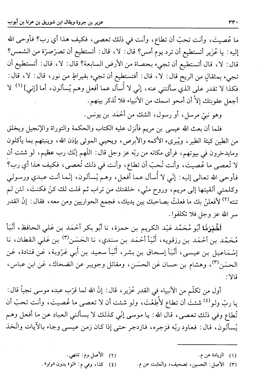 ما عصيت وأنت تحب أن تطاع وأنت في ذلك تعصى فكيف هذا أي رب فأوحى الله إليه يا عزير أتستطيع أن ترد يوم أمس قال لا قال أتستطيع أت تصرصرة من الشمس قال لا قال أتستطيع أن تجئ بحصاة من الأرض السابعة قال لا قال أتستطيع أن تجئ بمثقال من الريح قال لا قال أفتستطيع أن تجئ بقيراط من نور قال لا قال فكذا لا تقدر على الذي سألتني عنه إني لا أسأل عما أفعل وهم يسألون أما إني (1) لا أجعل عقوبتك إلا أن أمحو اسمك من الأنبياء فلا تذكر بينهم وهو نبي مرسل أو رسول الشك من أحمد بن يونس فلما أن بعث الله عيسى بن مريم فأنزل عليه الكتاب والحكمة والتوراة والإنجيل ويخلق من الطين كهيئة الطير ويبرئ الأكمه والأبرص ويحيى الموتى بإذن الله وينبئهم بما يأكلون وما يدخرون في بيوتهم فرأى مكانه من ربه عز وجل قال اللهم إنك رب عظيم لو شئت أن لا تعصى ما عصيت وأنت تحب أن تطاع وأنت في ذلك تعصى فكيف هذا أي رب فأوحى الله تعالى إليه إني لا أسأل عما أفعل وهم يسألون إنما أنت عبدي ورسولي وكلمتي ألقيتها إلى مريم وروح مني خلقتك من تراب ثم قلت لك كن فكنت لئن لم تنته (2) لأفعلن بك ما فعلت بصاحبك بين يديك فجمع الحواريين ومن معه فقال إن القدر سر الله عز وجل فلا تكلفوا أخبرنا أبو محمد عبد الكريم بن حمزة نا أبو بكر أحمد بن علي الحافظ أنبأ محمد بن أحمد بن رزقويه أنبأ أحمد بن سندي نا الحسن (3) بن علي القطان نا إسماعيل بن عيسى أنبأ إسحاق بن بشر أنبأ سعيد بن أبي عروبة عن قتادة عن الحسن (3) وهشام بن حسان عن الحسن ومقاتل وجويبر عن الضحاك عن ابن عباس قالا أول من تكلم من الأنبياء في القدر عزير قال إن الله لما قرب عبده موسى نجيا قال يا رب ولو (4) شئت أن تطاع لأطعت ولو شئت أن لا تعصى ما عصيت وأنت تحب أن تطاع وفي ذلك تعصى قال الله يا موسى إني كذلك لا يسألني العباد عن ما أقعل وهم يسألون قال فعاود ربه فزجره فازدجر حتى إذا كان زمن عيسى وجاء بالآيات واتخذ