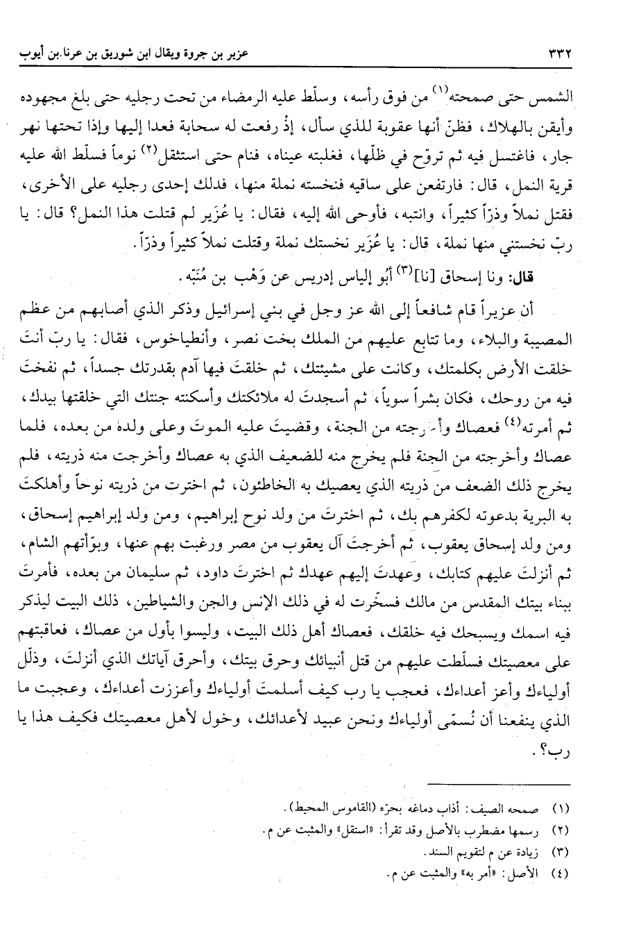 الشمس حتى صمحته (1) من فوق رأسه وسلط عليه الرمضاء من تحت رجليه حتى بلغ مجهوده وأيقن بالهلاك فظن أنها عقوبة للذي سأل إذ رفعت له سحابة فعدا إليها وإذا تحتها نهر جار فاغتسل فيه ثم تروح في ظلها فغلبته عيناه فنام حتى استثقل (2) نوما فسلط الله عليه قرية النمل قال فارتفعن على ساقيه فنخسته نملة منها فدلك إحدى رجليه على الأخرى فقتل نملا وذرا كثيرا وانتبه فأوحى الله إليه فقال يا عزير لم قتلت هذا النمل قال يا رب نخستني منها نملة قال يا عزير نخستك نملة وقتلت نملا كثيرا وذرا قال ونا إسحاق نا (3) أبو إلياس إدريس عن وهب بن منبه أن عزيرا قام شافعا إلى الله عز وجل في بني إسرائيل وذكر الذي أصابهم من عظم المصيبة والبلاء وما تتابع عليهم من الملك بخت نصر وأنطياخوس فقال يا رب أنت خلقت الأرض بكلمتك وكانت على مشيئتك ثم خلقت فيها آدم بقدرتك جسدا ثم نفخت فيه من روحك فكان بشرا سويا ثم أسجدت له ملائكتك وأسكنته جنتك التي خلقتها بيدك ثم أمرته (4) فعصاك وأخرجته من الجنة وقضيت عليه الموت وعلى ولده من بعده فلما عصاك وأخرجته من الجنة فلم يخرج منه للضعيف الذي به عصاك وأخرجت منه ذريته فلم يخرج ذلك الضعف من ذريته الذي يعصيك به الخاطئون ثم اخترت من ذريته منه ذريته نوحا وأهلكت به البرية بدعوته لكفرهم بك ثم اخترت من ولد نوح إبراهيم ومن ولد إبراهيم إسحاق ومن ولد إسحاق يعقوب ثم أخرجت آل يعقوب من مصر ورغبت بهم عنها وبوأتهم الشام ثم أنزلت عليهم كتابك وعهدت إليهم عهدك ثم اخترت داود ثم سليمان من بعده فأمرت ببناء بيتك المقدس من مالك فسخرت له في ذلك الإنس والجن والشياطين ذلك البيت ليذكر فيه اسمك ويسبحك فيه خلقك فعصاك أهل ذلك البيت وليسوا بأول من عصاك فعاقبتهم على معصيتك فسلطت عليهم من قتل أنبيائك وحرق بيتك وأحرق آياتك الذي أنزلت وذلل أولياءك وأعز أعداءك فعجب يا رب كيف أسلمت أولياءك وأعززت أعداءك وعجبت ما الذين ينفعنا أن نسمى أولياءك ونحن عبيد لأعدائك وخول لأهل معصيتك فكيف هذا يا رب