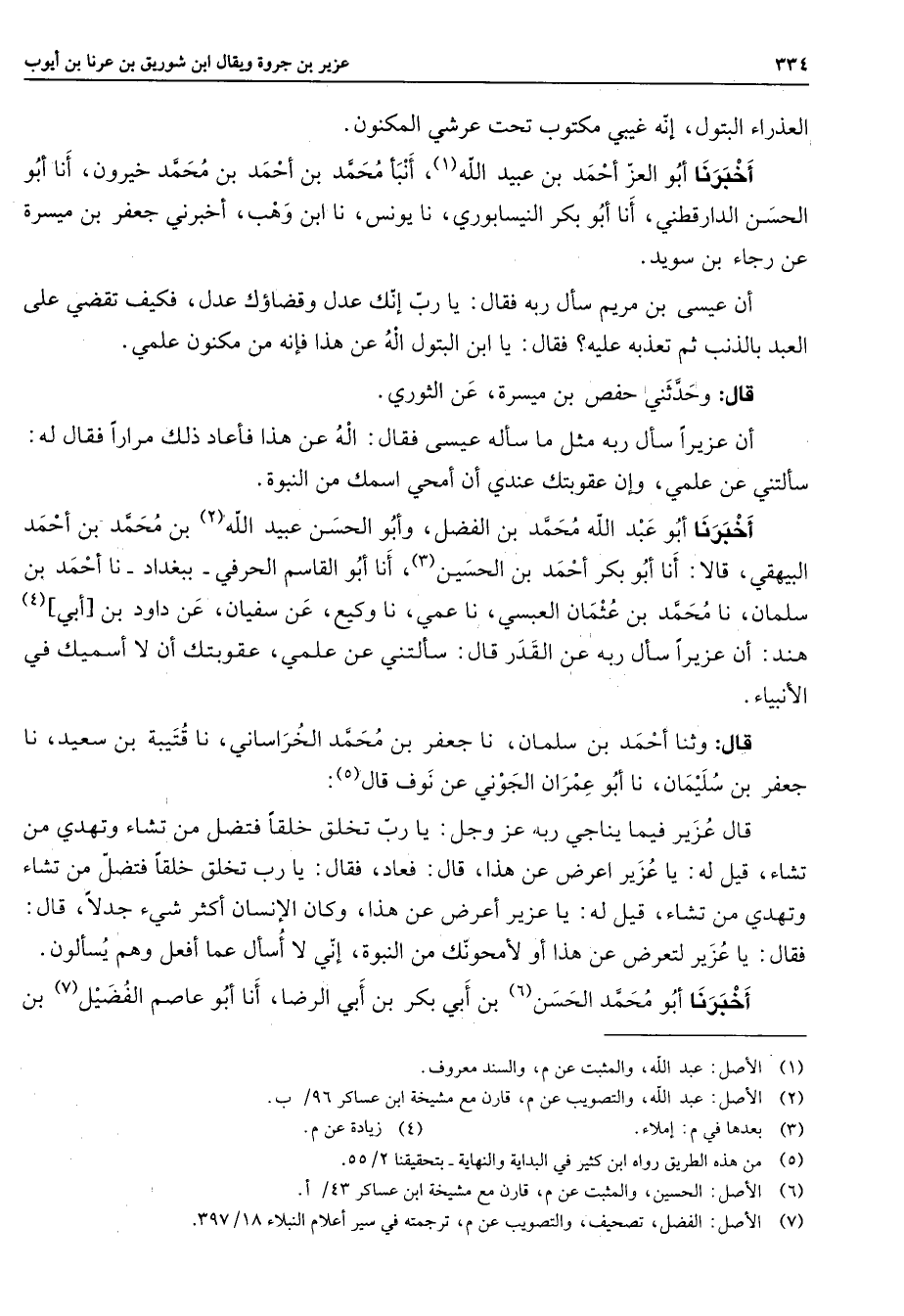 العذراء البتول إنه غيبي مكتوب تحت عرشي المكنون أخبرنا أبو العز أحمد بن عبيد الله (1) أنبأ محمد بن أحمد بن محمد خيرون أنا أبو الحسن الدارقطني أنا أبو بكر النيسابوري نا يونس نا ابن وهب أخبرني جعفر بن ميسرة عن رجاء بن سويد أن عيسى بن مريم سأل ربه فقال يا رب إنك عدل وقضاؤك عدل فكيف تقضي على العبد بالذنب ثم تعذبه عليه فقال يا ابن البتول اله عن هذا فإنه من مكنون علمي قال وحدثني حفص بن ميسرة عن الثوري أن عزيرا سأل ربه مثل ما سأله عيسى فقال اله عن هذا فأعاد ذلك مرارا فقال له سألتني عن علمي وإن عقوبتك عندي أن أمحي اسمك من النبوة أخبرنا أبو عبد الله محمد بن الفضل وأبو الحسن عبيد الله (2) بن محمد بن أحمد البيهقي قالا أنا أبو بكر أحمد بن الحسين (3) أنا أبو القاسم الحرفي ببغداد نا أحمد بن سلمان نا محمد بن عثمان العبسي نا عمي نا وكيع عن سفيان عن داود بن أبي (4) هند أن عزيرا سأل ربه عن القدر قال سألتني عن علمي عقوبتك أن لا أسميك في الأنبياء قال وثنا أحمد بن سلمان نا جعفر بن محمد الخراساني نا قتيبة بن سعيد نا جعفر بن سليمان نا أبو عمران الجوني عن نوف قال (5) قال عزير فيما يناجي ربه عز وجل يا رب تخلق خلقا فتضل من تشاء وتهدي من تشاء قيل له يا عزير اعرض عن هذا قال فعاد فقال يا رب تخلق خلقا فتضل من تشاء وتهدي من تشاء قيل له يا عزير أعرض عن هذا وكان الإنسان أكثر شئ جدلا قال فقال يا عزير لتعرض عن هذا أو لأمحونك من النبوة إني لا أسأل عما أفعل وهم يسألون أخبرنا أبو محمد الحسن (6) بن أبي بكر بن أبي الرضا أنا أبو عاصم الفضيل بن