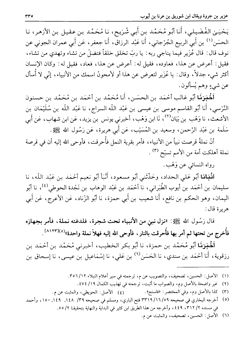 يحيى الفضيلي أنا أبو محمد بن أبي شريح نا محمد بن عقيل بن الأزهر نا الحسن (1) بن أبي الربيع الجرجاني أنا عبد الرزاق أنا جعفر عن أبي عمران الجوني عن نوف قال قال عزير فيما يناجي ربه يا رب تخلق خلقا فتضل من تشاء وتهدي من تشاء فقيل أعرض عن هذا فعاوده فقيل له أعرض عن هذا فعاد فقيل له وكان الإنسان أكثر شئ جدلا وقال يا عزير لتعرض عن هذا أو لأمحون أسمك من الأنبياء إني لا أسأل عن شئ وهم يسألون أخبرنا أبو غالب أحمد بن الحسن أنا محمد بن أحمد بن محمد بن حسنون النرسي أنا أبو القاسم موسى بن عيسى بن عبد الله السراج نا عبد الله بن سليمان بن الأشعث أنا وهب بن بيان (2) نا ابن وهب أخبرني يونس بن يزيد عن ابن شهاب عن أبي سلمة بن عبد الرحمن وسعيد بن المسيب عن أبي هريرة عن رسول الله (صلى الله عليه وسلم) أن نملة قرصت نبيا من الأنبياء فأمر بقرية النمل فأحرقت فأوحى الله إليه أن في قرصة نملة أهلكت أمة من الأمم تسبح (3) رواه النسائي عن وهب أنبأنا أبو علي الحداد وحدثني أبو مسعود أنبأ أبو نعيم أحمد بن عبد الله نا سليمان بن أحمد بن أيوب الطبراني نا أحمد بن عبد الوهاب بن نجدة الحوطي (4) نا أبو اليمان وهو الحكم بن نافع أنا شعيب بن أبي حمزة نا أبو الزناد عن الأعرج عن أبي هريرة قال قال رسول الله (صلى الله عليه وسلم) نزل نبي من الأنبياء تحت شجرة فلدغته نملة فأمر بجهازه فأخرج من تحتها ثم أمر بها فأحرقت بالنار فأوحى الله إليه فهلا نملة واحدة