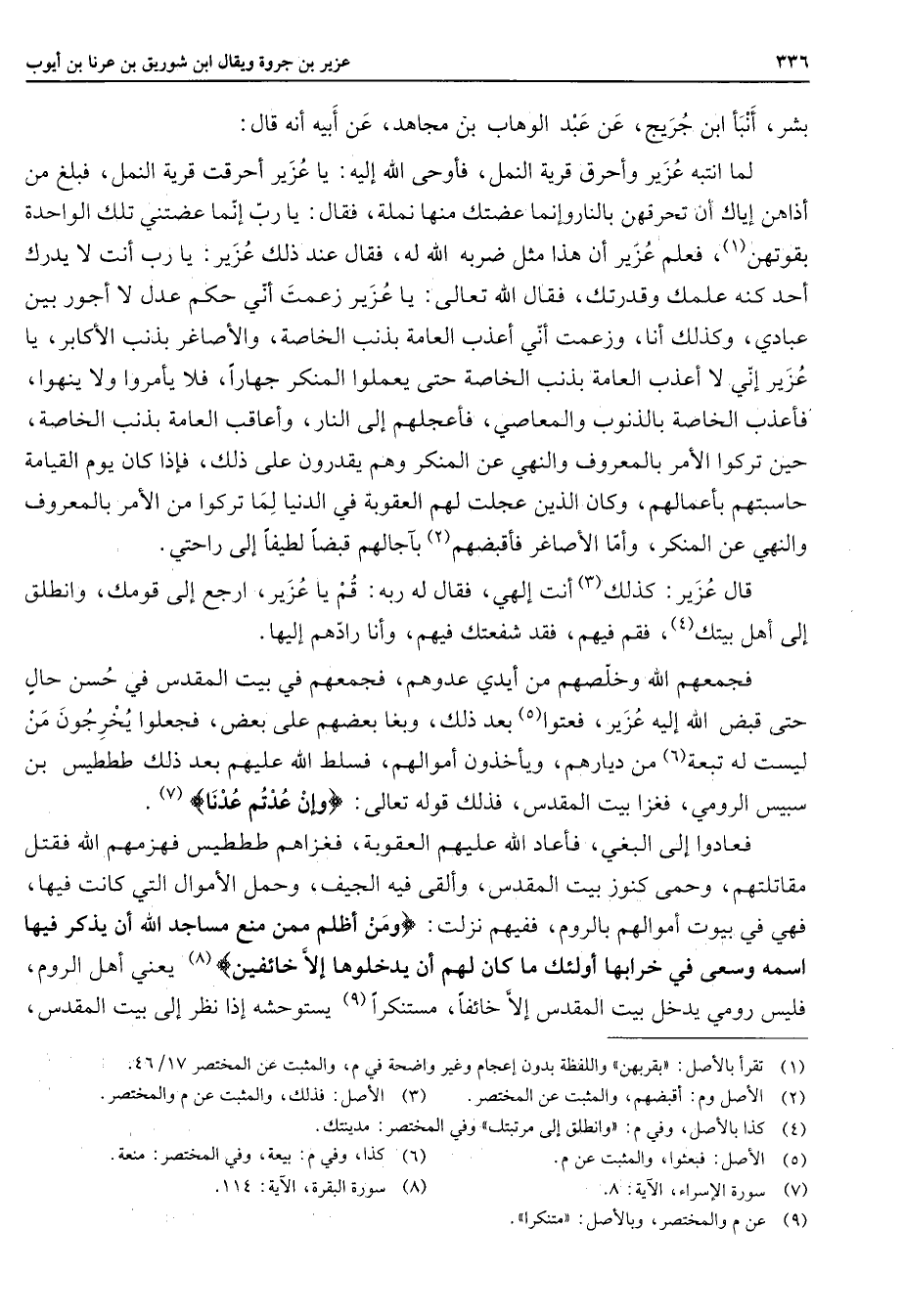 بشر أنبأ ابن جريج عن عبد الوهاب بن مجاهد عن أبيه أنه قال لما انتبه عزير وأحرق قرية النمل فأوحى الله إليه يا عزير أحرقت قرية النمل فبلغ من أذاهن إياك أن تحرقهن بالنار وإنما عضتك منها نملة فقال يا رب إنما عضتني تلك الواحدة بقوتهن (1) فعلم عزير أن هذا مثل ضربه الله له فقال عند ذلك عزير يا رب أنت لا يدرك أحد كنه علمك وقدرتك فقال الله تعالى يا عزير زعمت أني حكم عدل لا أجور بين عبادي وكذلك أنا وزعمت أني أعذب العامة بذنب الخاصة والأصاغر بذنب الأكابر يا عزير إني لا أعذب العامة بذنب الخاصة حتى يعملوا المنكر جهارا فلا يأمروا ولا ينهوا فأعذب الخاصة بالذنوب والمعاصي فأعجلهم إلى النار وأعاقب العامة بذنب الخاصة حين تركوا الأمر بالمعروف والنهي عن المنكر وهم يقدرون على ذلك فإذا كان يوم القيامة حاسبتهم بأعمالهم وكان الذين عجلت لهم العقوبة في الدنيا لما تركوا من الأمر بالمعروف والنهي عن المنكر وأما الأصاغر فأقبضهم (2) بآجالهم قبضا لطيفا إلى راحتي قال عزير كذلك (3) أنت إلهي فقال له ربه قم يا عزير ارجع إلى قومك وانطلق إلى أهل بيتك (4) فقم فيهم فقد شفعتك فيهم وأنا رادهم إليها فجمعهم الله وخلصهم من أيدي عدوهم فجمعهم في بيت المقدس في حسن حال حتى قبض الله إليه عزير فعتوا (5) بعد ذلك وبغا بعضهم على بعض فجعلوا يخرجون من ليست له تبعة (6) من ديارهم ويأخذون أموالهم فسلط الله عليهم بعد ذلك طططيس بن سبيس الرومي فغزا بيت المقدس فذلك قوله تعالى " وإن عدتم عدنا " (7) فعادوا إلى البغي فأعاد الله عليهم العقوبة فغزاهم طططيس فهزمهم الله فقتل مقاتلتهم وحمى كنوز بيت المقدس وألقى فيه الجيف وحمل الأموال التي كانت فيها فهي في بيوت أموالهم بالروم ففيهم نزلت " ومن أظلم ممن منع مساجد الله أن يذكر فيها اسمه وسعى في خرابها أولئك ما كان لهم أن يدخلوها إلا خائفين " (8) يعني أهل الروم فليس رومي يدخل بيت المقدس إلا خائفا مستنكرا (9) يستوحشه إذا نظر إلى بيت المقدس