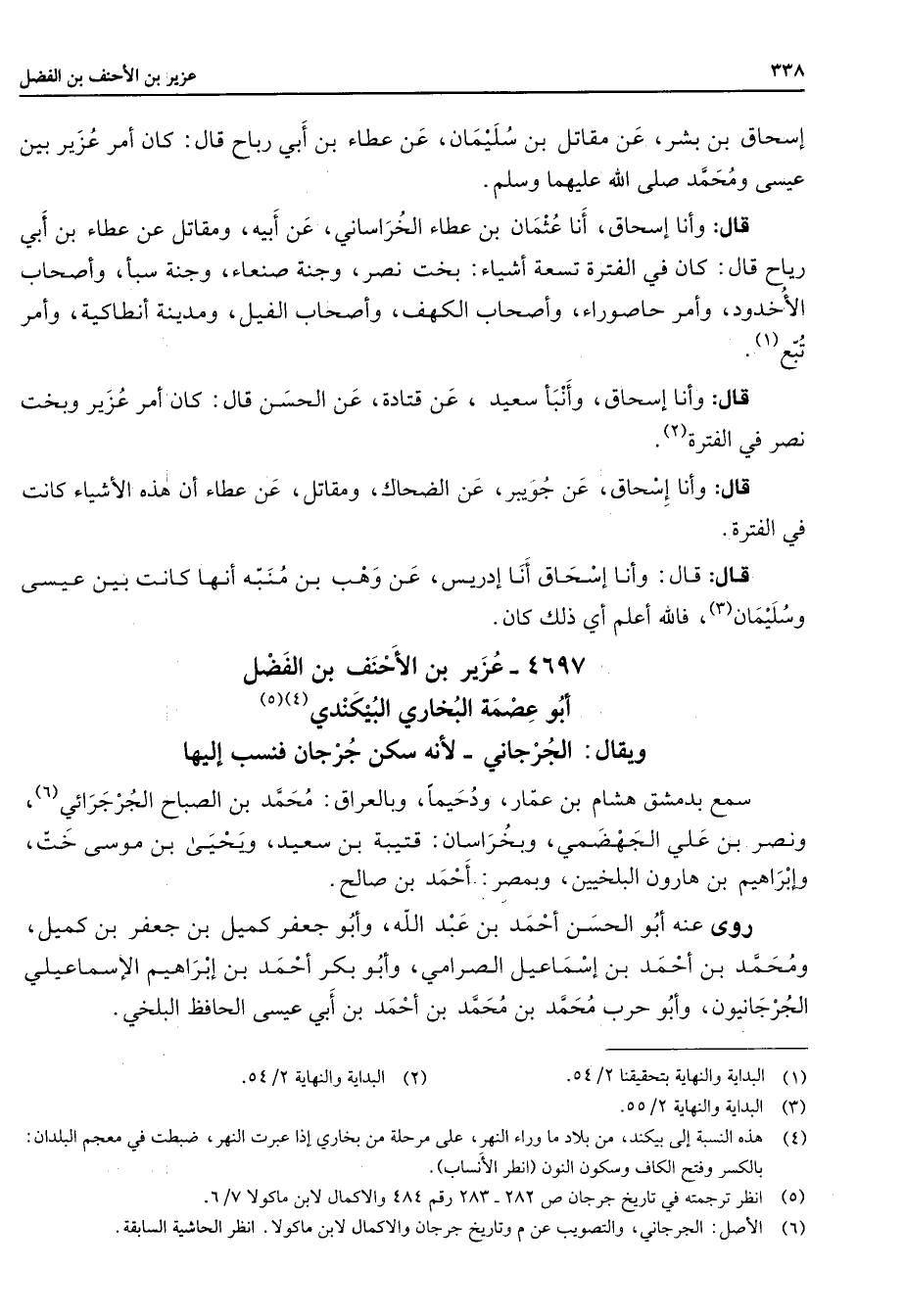 4697 - عزير بن الأحنف بن الفضل أبو عصمة البخاري البيكندي (4) (5) ويقال الجرجاني لأنه سكن جرجان فنسب إليها سمع بدمشق هشام بن عمار ودحيما وبالعراق محمد بن الصباح الجرجرائي (6) ونصر بن علي الجهضمي وبخراسان قتيبة بن سعيد ويحيى بن موسى خت وإبراهيم بن هارون البلخيين وبمصر أحمد بن صالح روى عنه أبو الحسن أحمد بن عبد الله وأبو جعفر كميل بن جعفر بن كميل ومحمد بن أحمد بن إسماعيل الصرامي وأبو بكر أحمد بن إبراهيم الإسماعيلي الجرجانيون وأبو حرب محمد بن محمد بن أحمد بن أبي عيسى الحافظ البلخي