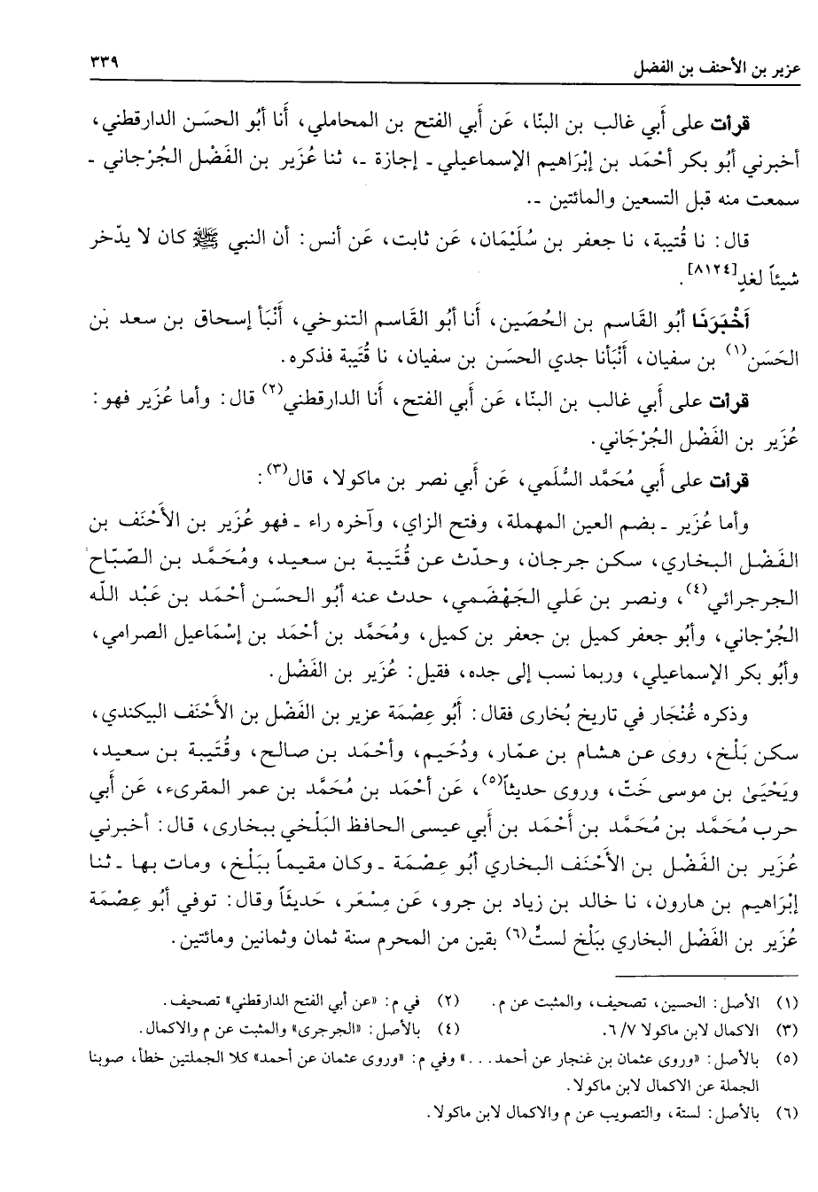 [8124] أخبرنا أبو القاسم بن الحصين أنا أبو القاسم التنوخي أنبأ إسحاق بن سعد بن الحسن (1) بن سفيان أنبأنا جدي بن سفيان نا قتيبة فذكره قرأت على أبي غالب بن البنا عن أبي الفتح أنا الدارقطني (2) قال وأما عزير فهو عزير بن الفضل الجرجاني قرأت على أبي محمد السلمي عن أبي نصر بن ماكولا قال (3) وأما عزير بضم العين المهملة وفتح الزاي وآخره راء فهو عزير بن الأحنف بن الفضل البخاري سكن جرجان وحدث عن قتبية بن سعيد ومحمد بن الصباح الجرجرائي (4) ونصر بن علي الجهضمي حدث عنه أبو الحسن أحمد بن عبد الله الجرجاني وأبو جعفر كميل بن جعفر بن كميل ومحمد بن أحمد بن إسماعيل الصرامي وأبو بكر الإسماعيلي وربما نسب إلى جده فقيل عزير بن الفضل وذكره غنجار في تاريخ بخارى فقال أبو عصمة عزير بن الفضل بن الأحنف البيكندي سكن بلخ روى عن هشام بن عمار ودحيم وأحمد بن صالح وقتيبة بن سعيد ويحيى بن موسى خت وروى حديثا (5) عن أحمد بن محمد بن عمر المقرئ عن أبي حرب محمد بن محمد بن أحمد بن أبي عيسى الحافظ البلخي ببخارى قال أخبرني عزير بن الفضل بن الأحنف البخاري أبو عصمة وكان مقيما ببلخ ومات بها ثنا إبراهيم بن هارون نا خالد بن زياد بن جرو عن مسعر حديثا وقال توفي أبو عصمة عزير بن الفضل البخاري ببلخ لست (6) بقين من المحرم سنة ثمان وثمانين ومائتين