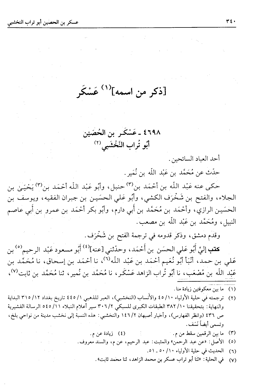 2 - () ترجمته في حلية الاولياء 10 / 45 والانساب (النخشبي) العبر للذهبي 1 / 445 تاريخ بغداد 12 / 315 البداية والنهاية: بتحقيقنا 10 / 382 الطبقات الكبرى للسبكي 2 / 306 سير أعلام النبلاء 11 / 545 الرسالة القشيرية ص 436 (وانظر الفهارس) وأخبار أصبهان 2 / 146 والنخشبي: هذه النسبة إلى نخشب مدينة من نواحي بلخ وتسمى أيضا نسف