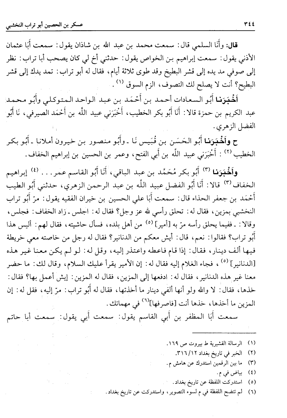 (4) إبراهيم الخفاف (5) قالا أن أبو الفضل عبيد الله بن عبد الرحمن الزهري حدثني أبو الطيب أحمد بن جعفر الحذاء قال سمعت أبا علي الحسين بن خيران الفقيه يقول مر أبو تراب النخشبي بمزين فقال له تحلق رأسي لله عز وجل فقال له اجلس زاد الخفاف فجلس وقالا ففيما يحلق رأسه مر به أمير (5) من أهل بلده فسأل حاشيته فقال لهم أليس هذا أبو تراب فقالوا نعم قال أيش معكم من الدنانير فقال له رجل من خاصته معي خريطة فيها ألف دينار فقال إذا قام فاعطه واعتذر إليه وقل له لو لم يكن معنا غير هذه الدنانير (5) فجاء الغلام إليه فقال له إن الأمير يقرأ عليك السلام وقال لك ما حضر معنا غير هذه الدنانير فقال له ادفعها إلى المزين فقال له المزين إيش أعمل بها فقال خذها فقال لا والله ولو أنها الفي دينار ما أخذتها فقال له أبو تراب مر إليه فقل له إن المزين ما أخذها خذها أنت فاصرفها (6) في مهماتك سمعت أبا المظفر بن أبي القاسم يقول سمعت أبي يقول سمعت أبا حاتم