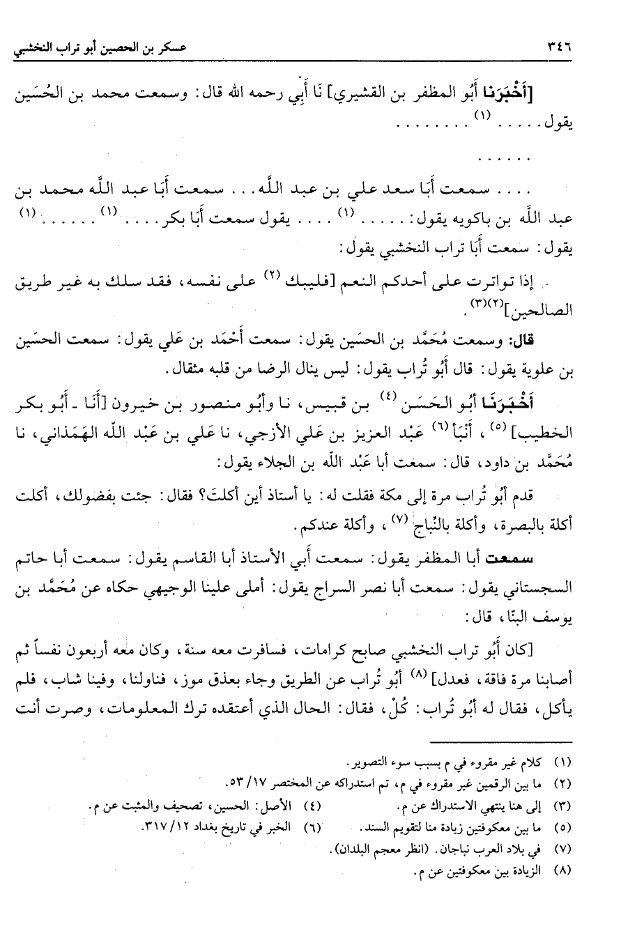 (1) يقول سمعت أبا تراب النخشبي يقول إذا تواترت على أحدكم النعم فليبك (2) على نفسه فقد سلك به غير طريق الصالحين (2) (3) قال وسمعت محمد بن الحسين يقول سمعت أحمد بن علي يقول سمعت الحسين بن علوية يقول قال أبو تراب يقول ليس ينال الرضا من قلبه مثقال أخبرنا أبو الحسن (4) بن قبيس نا وأبو منصور بن خيرون أنا أبو بكر الخطيب (5) أنبأ (6) عبد العزيز بن علي الأزجي نا علي بن عبد الله الهمذاني نا محمد بن داود قال سمعت أبا عبد الله بن الجلاء يقول قدم أبو تراب مرة إلى مكة فقلت له يا أستاذ أين أكلت فقال جئت بفضولك أكلت أكلة بالبصرة وأكلة بالنباج (7) وأكلة عندكم سمعت أبا المظفر يقول سمعت أبي الأستاذ أبا القاسم يقول سمعت أبا حاتم السجستاني يقول سمعت أبا نصر السراج يقول أملى علينا الوجيهي حكاه عن محمد بن يوسف البنا قال كان أبو تراب النخشبي صابح كرامات فسافرت معه سنة وكان معه أربعون نفسا ثم أصابنا مرة فاقة فعدل (8) أبو تراب عن الطريق وجاء بعذق موز فناولنا وفينا شاب فلم يأكل فقال له أبو تراب كل فقال الحال الذي أعتقده ترك المعلومات وصرت أنت