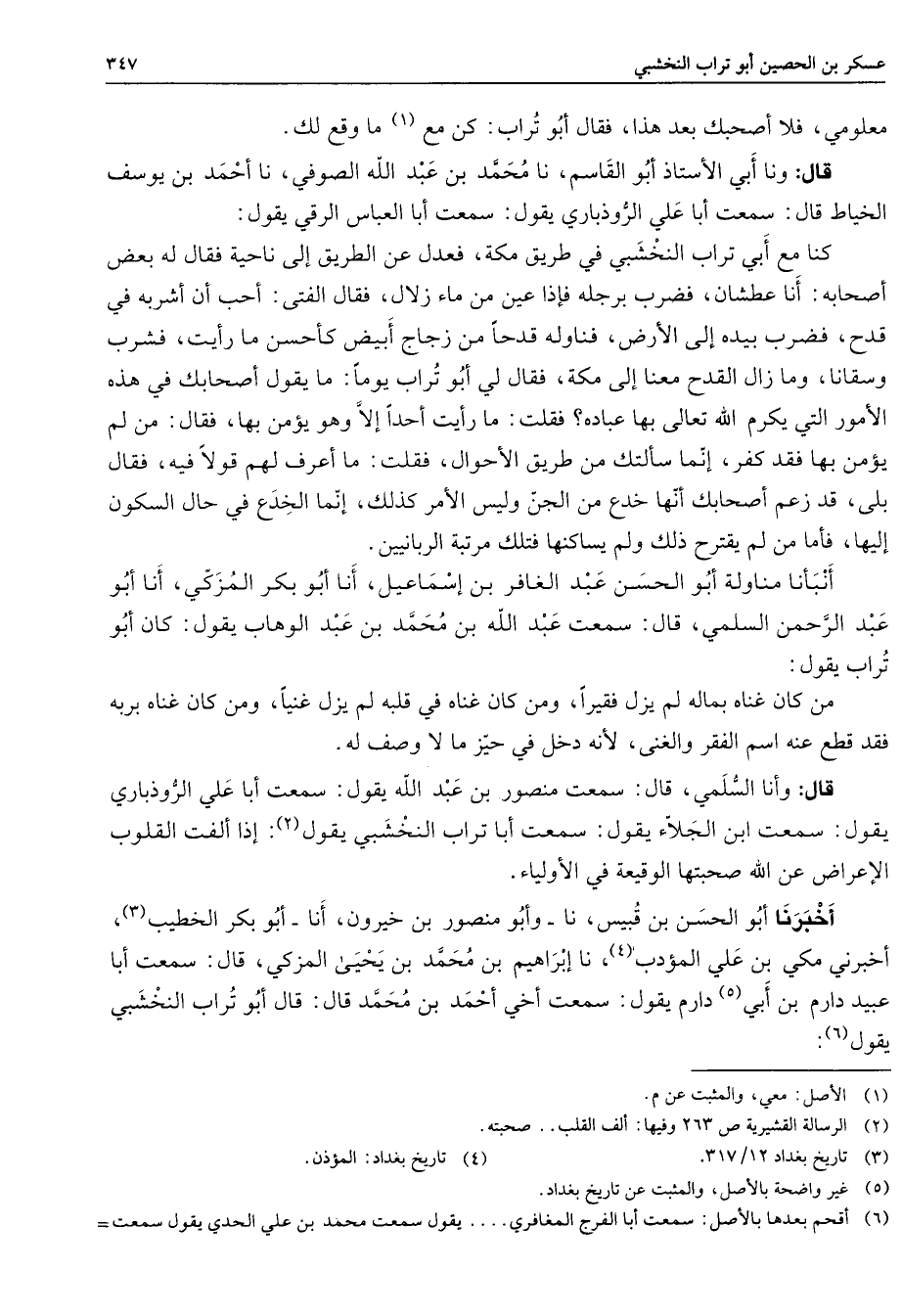 معلومي فلا أصحبك بعد هذا فقال أبو تراب كن مع ما (1) وقع لك قال ونا أبي الأستاذ أبو القاسم نا محمد بن عبد الله الصوفي نا أحمد بن يوسف الخياط قال سمعت أبا علي الروذباري يقول سمعت أبا العباس الرقي يقول كنا مع أبي تراب النخشبي في طريق مكة فعدل عن الطريق إلى ناحية فقال له بعض أصحابه أنا عطشان فضرب برجله فإذا عين من ماء زلال فقال الفتى أحب أن أشربه في قدح فضرب بيده إلى الأرض فناوله قدحا من زجاج أبيض كأحسن ما رأيت فشرب وسقانا ومازال القدح معنا إلى مكة فقال لي أبو تراب يوما ما يقول أصحابك في هذه الأمور التي يكرم الله تعالى بها عباده فقلت ما رأيت أحدا إلا وهو يؤمن بها فقال من لم يؤمن بها فقد كفر إنما سألتك من طريق الأحوال فقلت ما أعرف لهم قولا فيه فقال بلى قد زعم أصحابك أنها خدع من الجن وليس الأمر كذلك إنما الخدع في حال السكون إليها فأما من لم يقترح ذلك ولم يساكنها فتلك مرتبة الربانيين أنبأنا مناولة أبو الحسن عبد الغافر بن إسماعيل أنا أبو بكر المزكي أنا أبو عبد الرحمن السلمي قال سمعت عبد الله بن محمد بن عبد الوهاب يقول كان أبو تراب يقول من كان غناه بماله لم يزل فقيرا ومن كان غناه في قلبه لم يزل غنيا ومن كان غناه بربه فقد قطع عنه اسم الفقر والغنى لأنه دخل في حيز ما لا وصف له قال وأنا السلمي قال سمعت منصور بن عبد الله يقول سمعت أبا علي الروذباري يقول سمعت ابن الجلاء يقول سمعت أبا تراب النخشبي يقول (2) إذا ألفت القلوب الإعراض عن الله صحبتها الوقيعة في الأولياء أخبرنا أبو الحسن بن قبيس نا وأبو منصور بن خيرون أنا أبو بكر الخطيب (3) أخبرني مكي بن علي المؤدب (4) نا إبراهيم بن محمد بن يحيى المزكي قال سمعت أبا عبيد دارم بن أبي (5) دارم يقول سمعت أخي أحمد بن محمد قال قال أبو تراب النخشبي يقول (6)