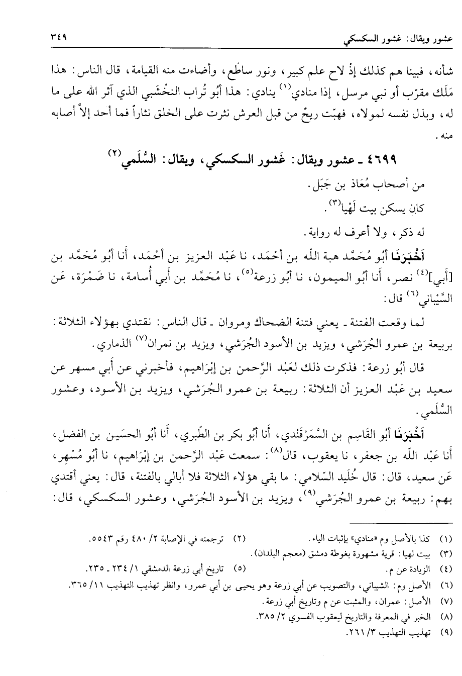 4699 - عشور ويقال غشور السكسكي ويقال السلمي (2) من أصحاب معاذ بن جبل كان يسكن بيت لهيا (3) له ذكر ولا أعرف له رواية أخبرنا أبو محمد هبة الله بن أحمد نا عبد العزيز بن أحمد أنا أبو محمد بن أبي (4) نصر أنا أبو الميمون نا أبو زرعة (5) نا محمد بن أبي أسامة نا ضمرة عن السيباني (6) قال لما وقعت الفتنة يعني فتنة الضحاك ومروان قال الناس نقتدي بهؤلاء الثلاثة بربيعة بن عمرو الجرشي ويزيد بن الأسود الجرشي ويزيد بن نمران (7) الذماري قال أبو زرعة فذكرت ذلك لعبد الرحمن بن إبراهيم فأخبرني عن أبي مسهر عن سعيد بن عبد العزيز أن الثلاثة ربيعة بن عمرو الجرشي ويزيد بن الأسود وعشور السلمي أخبرنا أبو القاسم بن السمرقندي أنا أبو بكر بن الطبري أنا أبو الحسين بن الفضل أنا عبد الله بن جعفر نا يعقوب قال (8) سمعت عبد الرحمن بن إبراهيم نا أبو مسهر عن سعيد قال قال خليد السلامي ما بقي هؤلاء الثلاثة فلا أبالي بالفتنة قال يعني أقتدي بهم ربيعة بن عمرو الجرشي (9) ويزيد بن الأسود الجرشي وعشور السكسكي قال