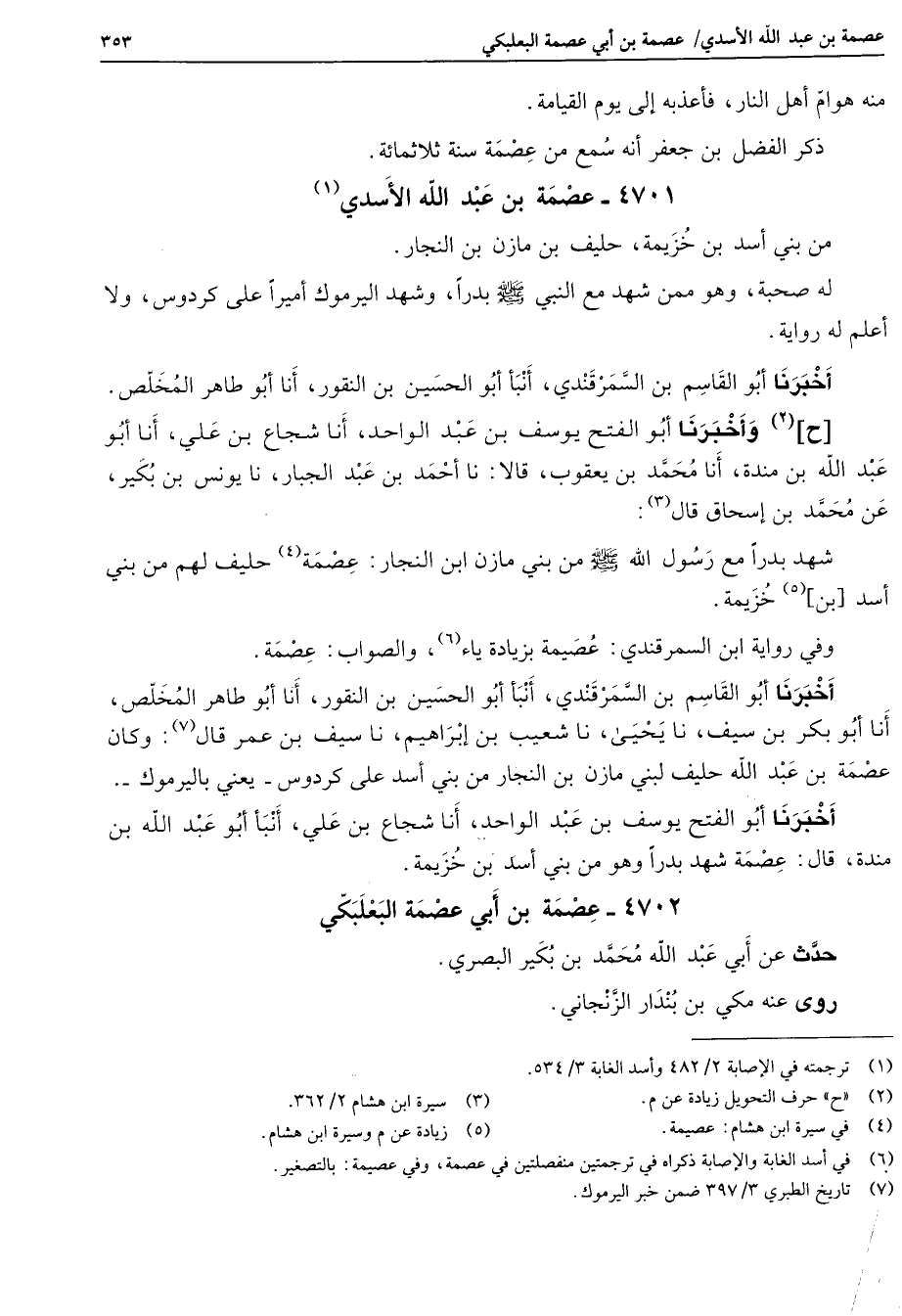 4701 - عصمة بن عبد الله الأسدي (1) من بني أسد بن خزيمة حليف بن مازن بن النجار له صحبة وهو ممن شهد مع النبي صلى الله عليه وسلم بدرا وشهد اليرموك أميرا على كردوس ولا أعلم له رواية أخبرنا أبو القاسم بن السمرقندي أنبأ أبو الحسين بن النقور أنا أبو طاهر المخلص ح (2) وأخبرنا أبو الفتح يوسف بن عبد الواحد أنا شجاع بن علي أنا أبو عبد الله بن مندة أنا محمد بن يعقوب قالا نا أحمد بن عبد الجبار نا يونس بن بكير عن محمد بن إسحاق قال (3) شهد بدرا مع رسول الله (صلى الله عليه وسلم) من بني مازن ابن النجار عصمة (4) حليف لهم من بني أسد بن (5) خزيمة وفرواية ابن السمرقندي عصيمة بزيادة ياء (6) والصواب عصمة أخبرنا أبو القاسم بن السمرقندي أنبأ أبو الحسين بن النقور أنا أبو طاهر المخلص أنا أبو بكر بن سيف نا يحيى نا شعيب بن إبراهيم نا سيف بن عمر قال (7) وكان عصمة بن عبد الله حليف لبني مازن بن النجار من بني أسد على كردوس يعني باليرموك أخبرنا أبو الفتح يوسف بن عبد الواحد أنا شجاع بن علي أنبأ أبو عبد الله بن مندة قال عصمة شهد بدرا وهو من بني أسد بن خزيمة
