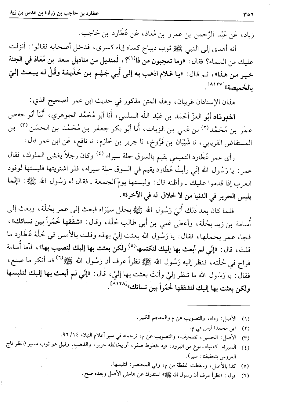 [8127] هذان الإسنادان غريبان وهذا المتن مذكور في حديث ابن عمر الصحيح الذي أخبرناه أبو العز أحمد بن عبد الله السلمي أنا أبو محمد الجوهري أنبأ أبو حفص عمر بن (2) محمد بن علي بن الزيات أنا أبو بكر جعفر بن محمد بن الحسن (3) بن المستفاض الفريابي أنا شيبان بن فروخ نا جرير بن حازم نا نافع عن ابن عمر قال رأى عمر عطارد التميمي يقيم بالسوق حلة سيراء (4) وكان رجلا يغشى الملوك فقال عمر يا رسول الله إني رأيت عطارط يقيم في السوق حلة سيراء فلو اشتريتها فلبستها لوفود العرب إذا قدموا عليك وأظنه قال ولبستها يوم الجمعة فقال له رسول الله (صلى الله عليه وسلم) إنما يلبس الحرير في الدنيا من لا خلاق له في الآخرة فلما كان بعد ذلك أتي رسول الله (صلى الله عليه وسلم) بحلل سيراء فبعث إلى عمر بحلة وبعث إلى أسامة بن زيد بحلة وأعطى علي بن ابي طالب حلة وقال شققها خمرا بين نسائك فجاء عمر يحملها فقال يا رسول الله بعثت إلي بهذه وقلت بالأمس في حلة عطارد ما قلت قال إني لم أبعث بها إليك لتكتسها (5) ولكن بعثت بها إليك لتصيب بها فاما أسامة فراح في حلته فنظر إليه رسول الله (صلى الله عليه وسلم) نظر عرف أن رسول الله (صلى الله عليه وسلم) (6) قد أنكر ما صنع فقال يارسول الله ما تنظر إلي وأنت بعثت بها إلي قال إني لم ابعث بها إليك لتلبسها ولكن بعثت بها إليك لتشققها خمرا بين نسائك