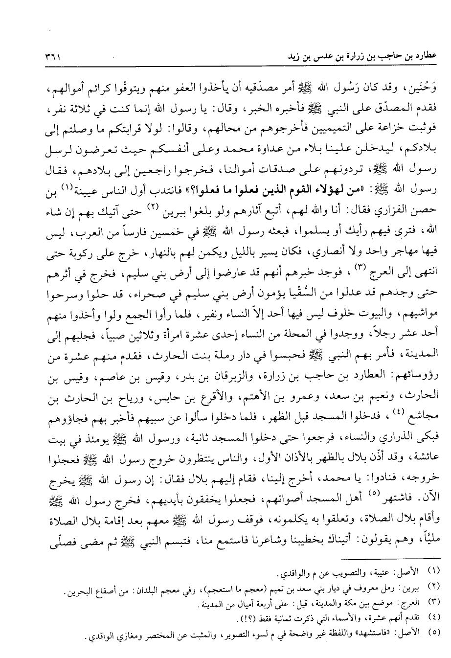 وحنين وقد كان رسول الله (صلى الله عليه وسلم) أمر مصدقيه أن يأخذوا العفو منهم ويتوقوا كرائم أموالهم فقدم المصدق على النبي (صلى الله عليه وسلم) فأخبره الخبر وقال يا رسول الله إنما كنت في ثلاثة نفر فوثبت خزاعة على التميميين فأخرجوهم من محالهم وقالوا لولا قرابتكم ما وصلتم إلى بلادكم ليدخلن علينا بلاء من عداوة محمد وعلى أنفسكم حيث تعرضون لرسل رسول الله (صلى الله عليه وسلم) تردونهم على صدقات أموالنا فخرجوا راجعين إلى بلادهم فقال رسول الله (صلى الله عليه وسلم) من لهؤلاء القوم الذي فعلوا ما فعلوا فانتدب أول الناس عيينة (1) بن حصن الفزاري فقال أنا والله لهم أتبع آثارهم ولو بلغوا ببرين (2) حتى آتيك بهم إن شاء الله فترى فيهم رأيك أو يسلموا فبعثه رسول الله (صلى الله عليه وسلم) في خمسين فارسا من العرب ليس فيها مهاجر واحد ولا أنصاري فكان يسير بالليل ويكمن لهم بالنهار خرج على ركوبة حتى انتهى إلى العرج (3) فوجد خبرهم أنهم قد عارضوا إلى أرض بني سليم فخرج في أثرهم حتى وجدهم قد عدلوا من السقيا يؤمون أرض بني سليم في صحراء قد حلوا وسرحوا مواشيهم والبيوت خلوف ليس فيها أحد إلا النساء ونفير فلما رأوا الجمع ولوا وأخذوا منهم أحد عشر رجلا ووجدوا في المحلة من النساء إحدى عشرة امرأة وثلاثين صبيا فجلبهم إلى المدينة فأمر بهم النبي (صلى الله عليه وسلم) فحبسوا في دار رملة بنت الحارث فقدم منهم عشرة من رؤسائهم العطاد بن حاجب بن زرارة والزبرقان بن بدر وقيس بن عاصم وقيس بن الحارث ونعيم بن سعد وعمرو بن الأهتم والأقرع بن حابس ورياح بن الحارث بن مجاشع (4) فدخلوا المسجد قبل الظهر فلما دخلوا سألوا عن سبيهم فأخبر بهم فجاؤوهم فبكى الذراري والنساء فرجعوا حتى دخلوا المسجد ثانية ورسول الله (صلى الله عليه وسلم) يومئذ في بيت عائشة وقد أذن بلال بالظهر بالأذان الأول والناس ينتظرون خروج رسول الله (صلى الله عليه وسلم) فعجلوا خروجه فنادوا يا محمد أخرج إلينا فقام إليهم بلال فقال إن رسول الله (صلى الله عليه وسلم) يخرج الآن فاشتهر (5) أهل المسجد أصواتهم فجعلوا يخفقون بأيديهم فخرج رسول الله (صلى الله عليه وسلم) وأقام بلال الصلاة وتعلقوا به يكلمونه فوقف رسول الله (صلى الله عليه وسلم) معهم بعد إقامة بلال الصلاة مليا وهم يقولون أتيناك بخطيبنا وشاعرنا فاستمع منا فتبسم النبي (صلى الله عليه وسلم) ثم مضى فصلى