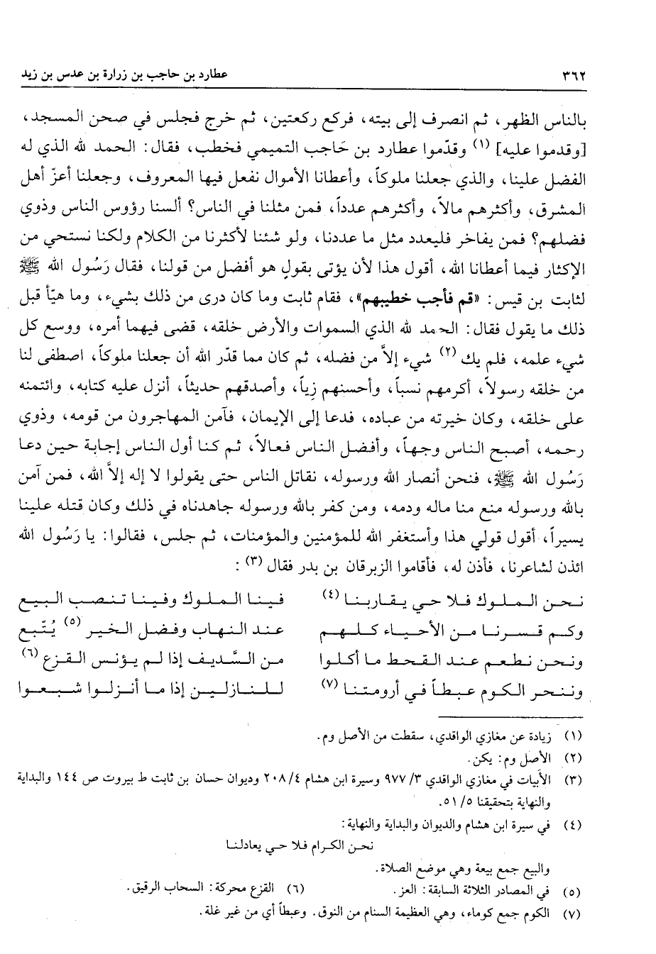 بالناس الظهر ثم انصرف إلى بيته فركع ركعتين ثم خرج فجلس في صحن المسجد وقدموا عليه (1) وقدموا عطارد بن حاجب التميمي فخطب فقال الحمد لله الذي له الفضل علينا والذي جعلنا ملوكا وأعطانا الأموال نفعل فيها المعروف وجعلنا أعز أهل المشرق وأكثرهم مالا وأكثرهم عددا فمن مثلنا في الناس ألسنا رؤوس الناس وذوي فضلهم فمن يفاخر فليعدد مثل ما عددنا ولو شئنا لأكثرنا من الكلام ولكنا نستحي من الإكثار فيما أعطانا الله أقول هذا لأن يؤتى بقول هو أفضل من قولنا فقال رسول الله (صلى الله عليه وسلم) لثابت بن قيس قم فأجب خطيبهم فقام ثابت وما كان درى من ذلك بشئ وما هيأ قبل ذلك ما يقول فقال الحمد لله الذي السموات والأرض خلقه قضى فيهما أمره ووسع كل شئ علمه فلم يك (2) شئ إلا من فضله ثم كان مما قدر الله أن جعلنا ملوكا اصطفى لنا من خلقه رسولا أكرمهم نسبا وأحسنهم زيا وأصدقهم حديثا أنزل عليه كتابه وائتمنه على خلقه وكان خيرته من عباده فدعا إلى الإيمان فآمن المهاجرون من قومه وذوي رحمه أصبح الناس وجها وأفضل الناس فعالا ثم كنا أول الناس إجابة حين دعا رسول الله (صلى الله عليه وسلم) فنحن أنصار الله ورسوله نقاتل الناس حتى يقولوا لا إله إلا الله فمن آمن بالله ورسوله منع منا ماله ودمه ومن كفر بالله ورسوله جاهدناه في ذلك وكان قتله علينا يسيرا أقول قولي هذا وأستغفر الله للمؤمنين والمؤمنات ثم جلس فقالوا يا رسول الله ائذن لشاعرنا فأذن له فأقاموا الزبرقان بن بدر فقال (3) * نحن الملوك فلا حي يقاربنا (4) * فينا الملوك وفينا تنصب البيع وكم قسرنا من الأحياء كلهم * عند النهاب وفضل الخير (5) يتبع ونحن نطعم عند القحط ما أكلوا * من السديف إذا لم يؤنس القزع (6) وننحر الكوم عبطا في أرومتنا (7) * للنازلين إذا ما أنزلوا شبعوا