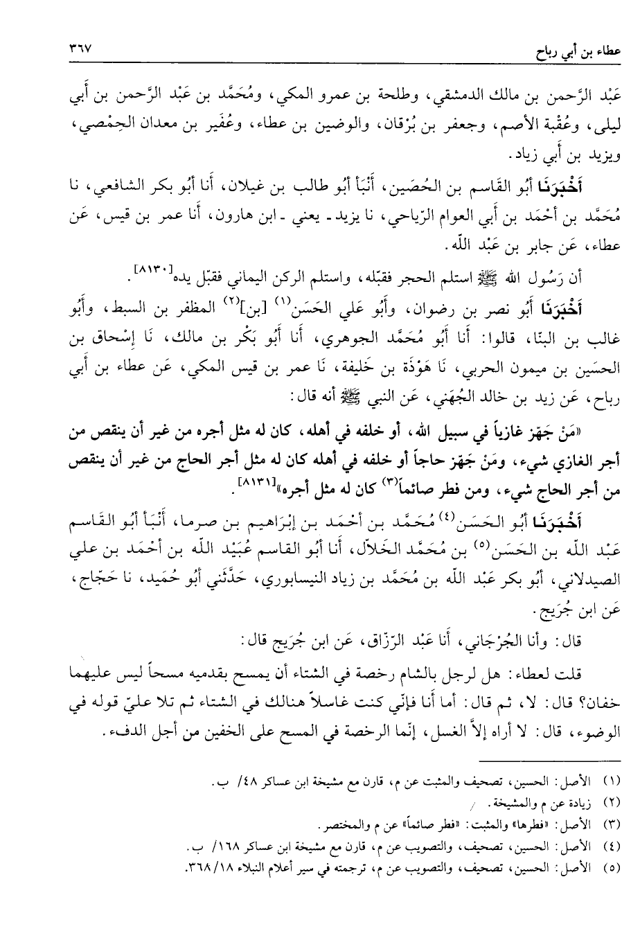 [8131] أخبرنا أبو الحسن (4) محمد بن أحمد بن إبراهيم بن صرما أنبأ أبو القاسم عبد الله بن الحسن (5) بن محمد الخلال أنا أبو القاسم عبيد الله بن أحمد بن علي الصيدلاني أبو بكر عبد الله بن محمد بن زياد النيسابوري حدثني أبو حميد نا حجاج عن ابن جريج قال وأنا الجرجاني أنا عبد الرزاق عن ابن جريج قال قلت لعطاء هل لرجل بالشام رخصة في الشتاء أن يمسح بقديمه مسحا ليس عليهما خفان قال لا ثم قال أما أنا فأني كنت غاسلا هنالك في الشتاء ثم تلا علي قوله في الوضوء قال لا اراه إلا الغسل إنما الرخصة في المسح على الخفين من اجل الدفء