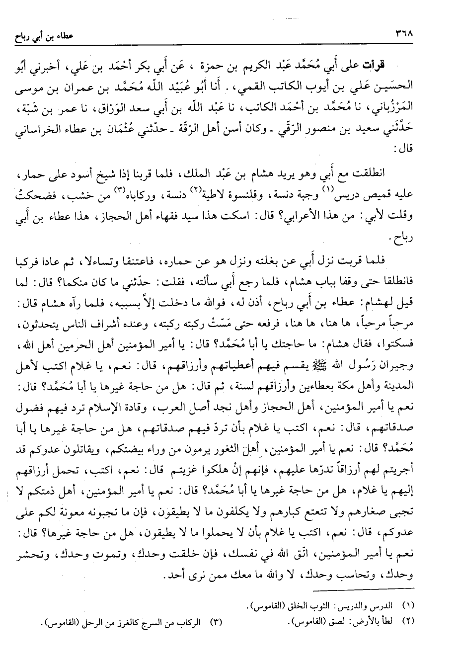 قرأت على أبي محمد عبد الكريم بن حمزة عن أبي بكر أحمد بن علي أخبرني أبو الحسين علي بن أيوب الكاتب القمي أنا أبو عبيد الله محمد بن عمران بن موسى المرزباني نا محمد بن أحمد الكاتب نا عبد الله بن أبي سعد الوراق نا عمر بن شبة حدثني سعيد بن منصور الرقي وكان أسن أهل الرقة حدثني عثمان بن عطاء الخراساني قال انطلقت مع أبي وهو يريد هشام بن عبد الملك فلما قربنا إذا شيخ أسود على حمار عليه قميص دريس (1) وجبة دنسة وقلنسوة لاطية (2) دنسة وركاباه (3) من خشب فضحكت وقلت لأبي من هذا الأعرابي قال اسكت هذا سيد فقهاء أهل الحجاز هذا عطاء بن أبي رباح فلما قربت نزل أبي عن بغلته ونزل هو عن حماره فاعتنقا وتساءلا ثم عادا فركبا فانطلقا حتى وقفا بباب هشام فلما رجع أبي سألته فقلت حدثني ما كان منكما قال لما قيل لهشام عطاء بن أبي رباح أذن له فوالله ما دخلت إلا بسببه فلما رآه هشام قال مرحبا مرحبا ها هنا ها هنا فرفعه حتى مست ركبته ركبته وعنده أشراف الناس يتحدثون فسكتوا فقال هشام ما حاجتك يا محمد قال يا أمير المؤمنين أهل الحرمين أهل الله وجيران رسول الله (صلى الله عليه وسلم) يقسم فيهم أعطياتهم وأرزاقهم قال نعم يا غلام اكتب لأهل المدينة وأهل مكة بعطاءين وأرزاقهم لسنة ثم قال هل من حاجة غيرها يا أبا محمد قال نعم يا أمير المؤمنين أهل الحجاز وأهل نجد أصل العرب وقادة الإسلام ترد فيهم فضول صدقاتهم قال نعم اكتب يا غلام بأن ترد فيهم صدقاتهم هل من حاجة غيرها يا با أبا محمد قال نعم يا أمير المؤمنين أهل الثغور يرمون من وراء بيضتكم ويقاتلون عدوكم قد أجريتم لهم أرزاقا تدرها عليهم فإنهم إن هلكوا غزيتم قال نعم اكتب تحمل أرزاقهم إليهم يا غلام هل من حاجة غيرها يا أبا محمد قال نعم يا أمير المؤمنين أهل ذمتكم لا تجبى صغارهم ولا تتعتع كبارهم ولا يكلفون ما لا يطيقون فإن ما تجبونه معونة لكم على عدوكم قال نعم اكتب يا غلام بأن لا يحملوا ما لا يطيقون هل من حاجة غيرها قال نعم يا أمير المؤمنين اتق الله في نفسك فإن خلقت وحدك وتموت وحدك وتحشر وحدك وتحاسب وحدك لا والله ما معك ممن نرى أحد