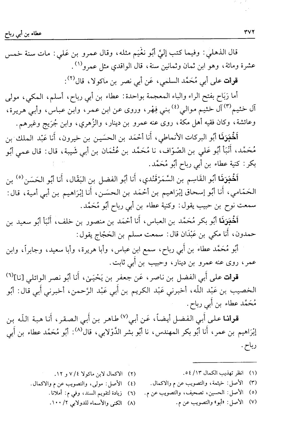 قال الذهلي وفيما كتب إلي أبو نعيم مثله وقال عمرو بن علي مات سنة خمس عشرة ومائة وهو ابن ثمان وثمانين سنة قال الواقدي مثل عمرو (1) قرأت على أبي محمد السلمي عن أبي نصر بن ماكولا قال (2) أما رباح بفتح الراء والباء المعجمة بواحدة عطاء بن أبي رباح أسلم المكي مولى آل خثيم (3) آل خثيم موالي (4) بني فهر وروى عن ابن عمر وابن عباس وأبي هريرة وعائشة وكان فقيه أهل مكة روى عنه عمرو بن دينار والزهري وابن جريج وغيرهم أخبرنا أبو البركات الأنماطي نا أحمد بن الحسين بن خيرون أنا عبد الملك بن محمد أنبأ أبو علي بن الصواف أنا محمد بن عثمان بن أبي شيبة قال قال عمي أبو بكر كنية عطاء بن أبي رباح أبو محمد أخبرنا أبو القاسم بن السمرقندي أنا أبو الفضل بن البقال أنا أبو الحسن (5) بن الحمامي أنا أبو إسحاق إبراهيم بن أحمد بن الحسن أنا إبراهيم بن أبي أمية قال سمعت نوح بن حبيب يقول وكنية عطاء بن أبي رباح أبو محمد أخبرنا أبو بكر محمد بن العباس أنا أحمد بن منصور بن خلف أنبأ أبو سعيد بن حمدون أنا مكي بن عبدان قال سمعت مسلم بن الحجاج يقول أبو محمد عطاء بن أبي رباح سمع ابن عباس وأبا هريرة وأبا سعيد وجابرا وابن عمر روى عنه عمرو بن دينار وحبيب بن أبي ثابت قرأت على أبي الفضل بن ناصر عن جعفر بن يحيى أنا أبو نصر الوائلي نا (6) الخصيب بن عبد الله أخبرني عبد الكريم بن أبي عبد الرحمن أخبرني أبي قال أبو محمد عطاء بن أبي رباح قرأنا على أبي الفضل أيضا عن أبي (7) طاهر بن أبي الصقر أنا هبة الله بن إبراهيم بن عمر أنا أبو بكر المهندس نا أبو بشر الدولابي قال (8) أبو محمد عطاء بن أبي رباح