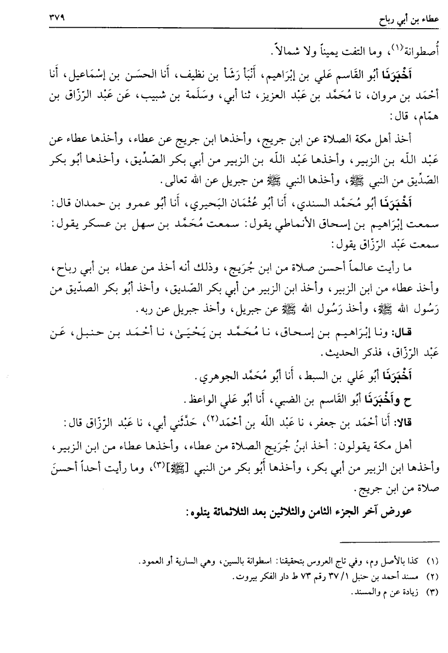 اصطوانة (1) وما التفت يمينا ولا شمالا أخبرنا أبو القاسم علي بن إبراهيم أنبأ رشأ بن نظيف أنا الحسن بن إسماعيل أنا أحمد بن مروان نا محمد بن عبد العزيز ثنا أبي وسلمة بن شبيب عن عبد الرزاق بن همام قال أخذ أهل مكة الصلاة عن ابن جريج وأخذها ابن جريج عن عطاء وأخذها عطاء عن عبد الله بن الزبير وأخذها عبد الله بن الزبير من أبي بكر الصديق وأخذها أبو بكر الصديق من النبي (صلى الله عليه وسلم) وأخذها النبي (صلى الله عليه وسلم) من جبريل عن الله تعالى أخبرنا أبو محمد السندي أنا أبو عثمان البحيري أنا أبو عمرو بن حمدان قال سمعت إبراهيم بن إسحاق الأنماطي يقول سمعت محمد بن سهل بن عسكر يقول سمعت عبد الرزاق يقول ما رأيت عالما أحسن صلاة من ابن جريج وذلك أنه أخذ من عطاء بن أبي رباح وأخذ عطاء من ابن الزبير وأخذ ابن الزبير من أبي بكر الصديق وأخذ أبو بكر الصديق من رسول الله (صلى الله عليه وسلم) وأخذ رسول الله (صلى الله عليه وسلم) عن جبريل وأخذ جبريل عن ربه قال ونا إبراهيم بن إسحاق نا محمد بن يحيى نا أحمد بن حنبل عن عبد الرزاق فذكر الحديث أخبرنا أبو علي بن السبط أنا أبو محمد الجوهري ح وأخبرنا أبو القاسم بن الضبي أنا أبو علي الواعظ قالا أنا أحمد بن جعفر نا عبد الله بن أحمد (2) حدثني أبي نا عبد الرزاق قال أهل مكة يقولون أخذ ابن جريج الصلاة من عطاء وأخذها عطاء من ابن الزبير وأخذها ابن الزبير من أبي بكر وأخذها أبو بكر من النبي (صلى الله عليه وسلم) (3) وما رأيت أحدا أحسن صلاة من ابن جريج عورض آخر الجزء الثامن والثلاثين بعد الثلاثمائة يتلوه