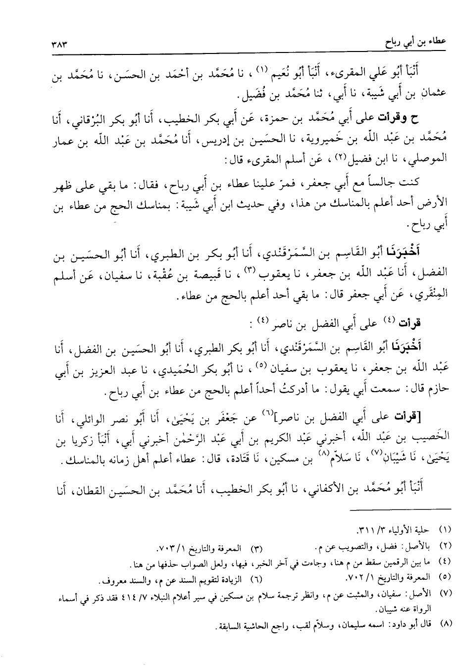 أنبأ أبو علي المقرئ أنبأ أبو نعيم (1) نا محمد بن أحمد بن الحسن نا محمد بن عثمان بن أبي شيبة نا أبي ثنا محمد بن فضيل ح وقرأت على أبي محمد بن حمزة عن أبي بكر الخطيب أنا أبو بكر البرقاني أنا محمد بن عبد الله بن خميروية نا الحسين بن إدريس أنا محمد بن عبد الله بن عمار الموصلي نا ابن فضيل (2) عن أسلم المقرئ قال كنت جالسا مع أبي جعفر فمر علينا عطاء بن أبي رباح فقال ما بقي على ظهر الأرض أحد أعلم بالمناسك من هذا وفي حديث ابن أبي شيبة بمناسك الحج من عطاء بن أبي رباح أخبرنا أبو القاسم بن السمرقندي أنا أبو بكر بن الطبري أنا أبو الحسين بن الفضل أنا عبد الله بن جعفر نا يعقوب (3) نا قبيصة بن عقبة نا سفيان عن أسلم المنقري عن أبي جعفر قال ما بقي أحد أعلم بالحج من عطاء قرأت (4) على أبي الفضل بن ناصر (4) أخبرنا أبو القاسم بن السمرقندي أنا أبو بكر الطبري أنا أبو الحسين بن الفضل أنا عبد الله بن جعفر نا يعقوب بن سفيان (5) نا أبو بكر الحميدي نا عبد العزيز بن أبي حازم قال سمعت أبي يقول ما أدركت أحدا أعلم بالحج من عطاء بن أبي رباح قرأت على أبي الفضل بن نصار (6) عن جعفر بن يحيى أنا أبو نصر الوائلي أنا الخصيب بن عبد الله أخبرني عبد الكريم بن أبي عبد الرحمن أخبرني أبي أنبأ زكريا بن يحيى نا شيبان (7) نا سلام (8) بن مسكين نا قتادة قال عطاء أعلم أهل زمانه بالمناسك أنبأ أبو محمد بن الأكفاني نا أبو بكر الخطيب أنا محمد بن الحسين القطان أنا