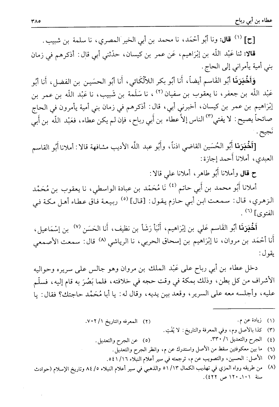 ح (1) قال ونا أبو أحمد نا محمد بن أبي الخير المصري نا سلمة بن شبيب قالا ثنا عبد الله بن إبراهيم عن عمر بن كيسان حدثني أبي قال أذكرهم في زمان بني أمية يأمراني إلى الحاج وأخبرنا أبو القاسم أيضا أنا أبو بكر اللالكائي أنا أبو الحسين بن الفضل أنا أبو عبد الله بن جعفر نا يعقوب بن سفيان (2) نا سلمة بن شبيب نا عبد الله بن عمر بن إبراهيم بن عمر بن كيسان أخبرني أبي قال أذكرهم في زمان بني أمية يأمرون في الحاج صائحا يصيح لا يفتي (3) الناس إلا عطاء بن أبي رباح فإن لم يكن عطاء فعبد الله بن أبي نجيح أخبرنا أبو الحسين القاضي إذنا وأبو عبد الله الأديب مشافهة قالا أملانا أبو القاسم العبدي أملانا أحمد إجازة قال وأملانا أبو طاهر أملانا علي قالا أملانا أبو محمد بن أبي حاتم (4) نا محمد بن عبادة الواسطي نا يعقوب بن محمد الزهري قال سمعت ابن أبي حازم يقول قال (5) ربيعة فاق عطاء أهل مكة في الفتوى (6) أخبرنا أبو القاسم علي بن إبراهيم أنبأ رشأ بن نظيف أنا الحسن (7) بن إسماعيل أنا أحمد بن مروان نا إبراهيم بن إسحاق الحربي نا الرياشي (8) قال سمعت الأصمعي يقول دخل عطاء بن أبي رباح على عبد الملك بن مروان وهو جالس على سريره وحواليه الأشراف من كل بطن وذلك بمكة في وقت حجه في خلافته فلما بصر به قام إليه فسلم عليه وأجلسه معه على السرير وقعد بين يديه وقال له يا أبا محمد حاجتك فقال يا