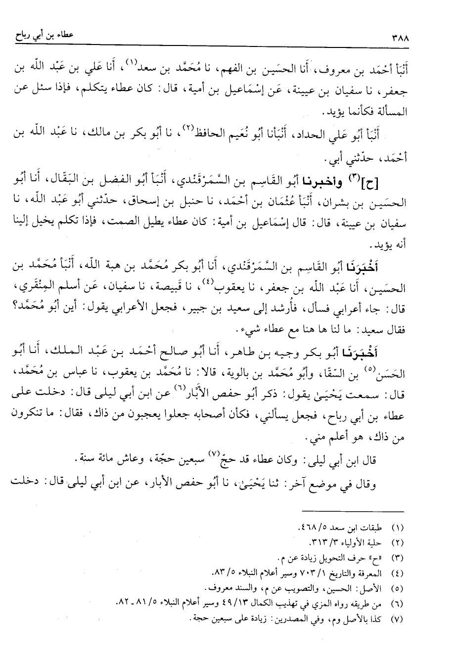 أنبأ أحمد بن معروف أنا الحسين بن الفهم نا محمد بن سعد (1) أنا علي بن عبد الله بن جعفر نا سفيان بن عيينة عن إسمايعل بن أمية قال كان عطاء يتكلم فإذا سئل عن المسألة فكأنما يؤيد أنبأ أبو علي الحداد أنبأنا أبو نعيم الحافظ (2) نا أبو بكر بن مالك نا عبد الله بن أحمد حدثني أبي ح (3) وأخبرنا أبو القاسم بن السمرقندي أنبأ أبو الفضل بن البقال أنا أبو الحسين بن بشران أنبأ عثمان بن أحمد نا حنبل بن إسحاق حدثني أبو عبد الله نا سفيان بن عيينة قال قال إسماعيل بن أمية كان عطاء يطيل الصمت فإذا تكلم يخيل إلينا أنه يؤيد أخبرنا أبو القاسم بن السمرقندي أنا أبو بكر محمد بن هبة الله أنبأ محمد بن الحسين أنا عبد الله بن جعفر نا يعقوب (4) نا قبيصة نا سفيان عن أسلم المنقري قال جاء أعرابي فسأل فأرشد إلى سعيد بن جبير فجعل الأعرابي يقول أين أبو محمد فقال سعيد ما لنا ها هنا مع عطاء شئ أخبرنا أبو بكر وجيه بن طاهر أنا أبو صالح أحمد بن عبد الملك أنا أبو الحسن (5) بن السقا وأبو محمد بن بالوية قالا نا محمد بن يعقوب نا عباس بن محمد قال سمعت يحيى يقول ذكر أبو حفص الأبار عن (6) ابن أبي ليلى قال دخلت على عطاء بن أبي رباح فجعل يسألني فكأن أصحابه جعلوا يعجبون من ذاك فقال ما تنكرون من ذاك هو أعلم مني قال ابن أبي ليلى وكان عطاء قد حج (7) سبعين حجة وعاش مائة سنة وقال في موضع آخر ثنا يحيى نا أبو حفص الأبار عن ابن أبي ليلى قال دخلت