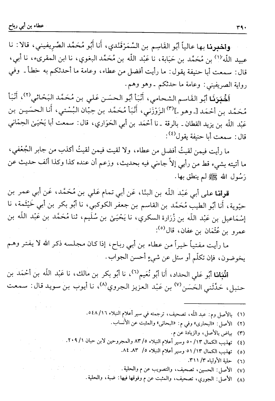 وأخبرنا بها عاليا أبو القاسم بن السمرقندي أنا أبو محمد الصريفيني قالا نا عبيد الله (1) بن محمد بن حبابة نا عبد الله بن محمد البغوي نا ابن المقرئ نا أبي قال سمعت أبا حنيفة يقول ما رأيت أفضل من عطاء وعامة ما أحدثكم به خطأ وفي رواية الصريفيني وعامة ما حدثكم وهو وهم أخبرنا أبو القاسم الشحامي أنبأ أبو الحسن علي بن محمد البحاثي (2) أنبأ محمد بن أحمد وهو (3) الزوزني أنبأ محمد بن حبان البستي أنا الحسين بن عبد الله بن يزيد القطان بالرقة نا أحمد بن أبي الحواري قال سمعت أبا يحيى الحماني قال سمعت أبا حنيفة يقول (4) ما رأيت فيمن لقيت أفضل من عطاء ولا لقيت فيمن لقيت أكذب من جابر الجعفي ما أتيته بشئ قمن رأيي إلا جاءني فيه بحديث وزعم أنه عنده كذا وكذا ألف حديث عن رسول الله (صلى الله عليه وسلم) لم ينطق بها قرأنا على أبي عبد الله بن البنا عن أبي تمام علي بن محمد عن أبي عمر بن حيوية أنا أبو الطيب محمد بن القاسم بن جعفر الكوكبي نا أبو بكر بن أبي خيثمة نا إسماعيل بن عبد الله بن زرارة السكري نا يحيى بن سليم ثنا محمد بن عبد الله بن عمرو بن عثمان بن عفان قال (5) ما رأيت مفتيا خيرا من عطاء بن أبي رباح إذا كان مجلسه ذكر الله لا يفتر وهم يخوضون فإن تكلم أو سئل عن شئ أحسن الجواب أنبأنا أبو علي الحداد أنا أبو نعيم (6) نا أبو بكر بن مالك نا عبد الله بن أحمد بن حنبل حدثني الحسن (7) بن عبد العزيز الجروي (8) نا أيوب بن سويد قال سمعت