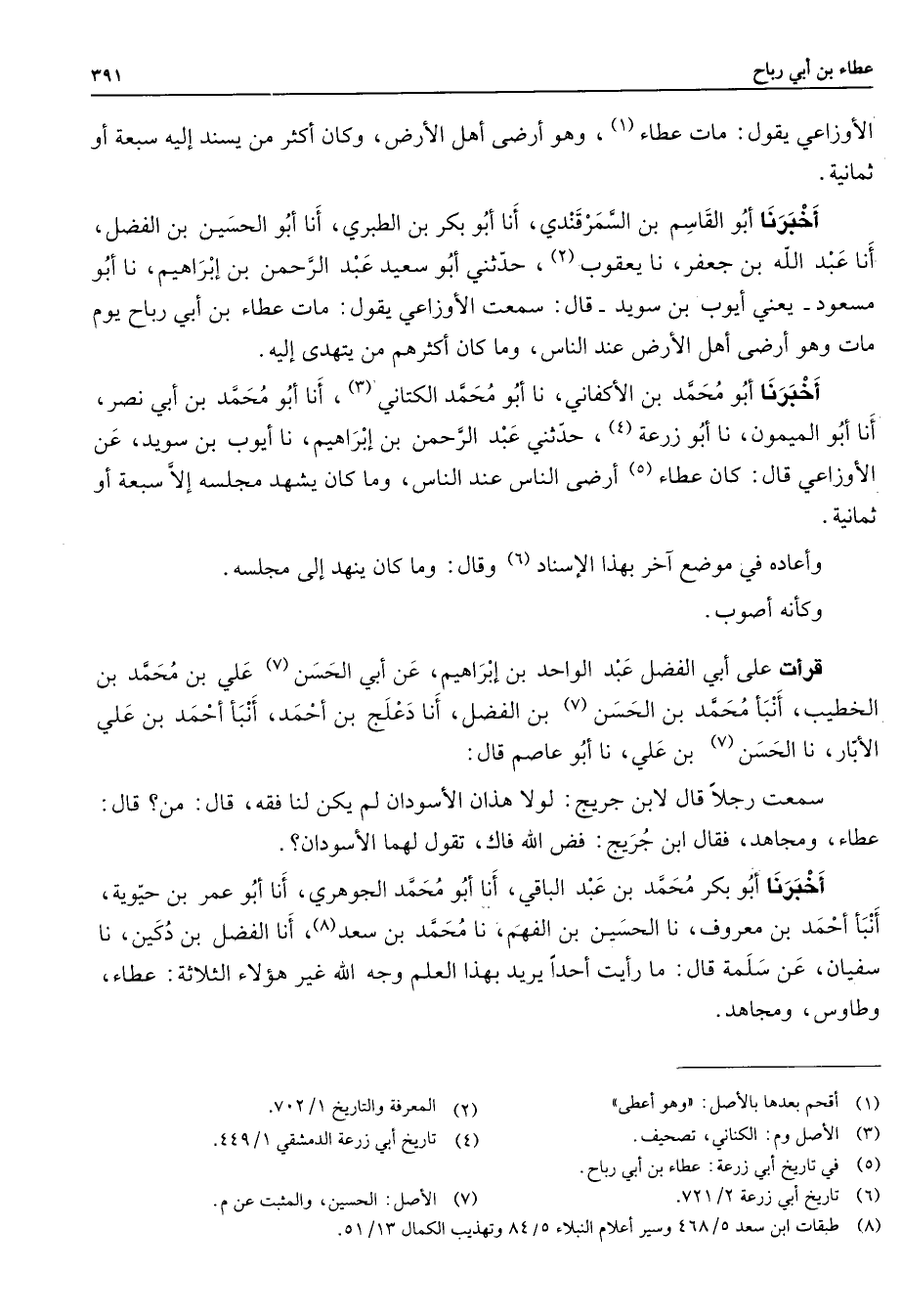 الأوزاعي يقول مات عطاء (1) وهو أرضى أهل الأرض وكان أكثر من يسند إليه سبعة أو ثمانية أخبرنا أبو القاسم بن السمرقندي أنا أبو بكر بن الطبري أنا أبو الحسين بن الفضل أنا عبد الله بن جعفر نا يعقوب (2) حدثني أبو سعيد عبد الرحمن بن إبراهيم نا أبو مسعود يعني أيوب بن سويد قال سمعت الأوزاعي يقول مات عطاء بن أبي رباح يوم مات وهو أرضى أهل الأرض عند الناس وما كان أكثرهم من يتهدى إليه أخبرنا أبو محمد بن الأكفاني نا أبو محمد الكتاني (3) أنا أبو محمد بن أبي نصر أنا أبو الميمون نا أبو زرعة (4) حدثني عبد الرحمن بن إبراهيم نا أيوب بن سويد عن الأوزاعي قال كان عطاء (5) أرضى الناس عند الناس وما كان يشهد مجلسه إلا سبعة أو ثمانية وأعاده في موضع آخر بهذا الإسناد (6) وقال وما كان ينهد إلى مجلسه وكأنه أصوب قرأت على أبي الفضل عبد الواحد بن إبراهيم عن أبي الحسن (7) علي بن محمد بن الخطيب أنبأ محمد بن الحسن (7) بن الفضل أنا دعلج بن أحمد أنبأ أحمد بن علي لأبار نا الحسن (7) بن علي نا أبو عاصم قال سمعت رجلا قال لإبن جريج لولا هذان الأسودان لم يكن لنا فقه قال من قال عطاء ومجاهد فقال ابن جريج فض الله فاك تقول لهما الأسودان أخبرنا أبو بكر محمد بن عبد الباقي أنا أبو محمد الجوهر أنا أبو عمر بن حيوية أنبأ أحمد بن معروف نا الحسين بن الفهم نا محمد بن سعد (8) أنا الفضل بن دكين نا سفيان عن سملة قال ما رأيت أحدا يريد بهذا العلم وجه الله غير هؤلاء الثلاثة عطاء وطاوس ومجاهد