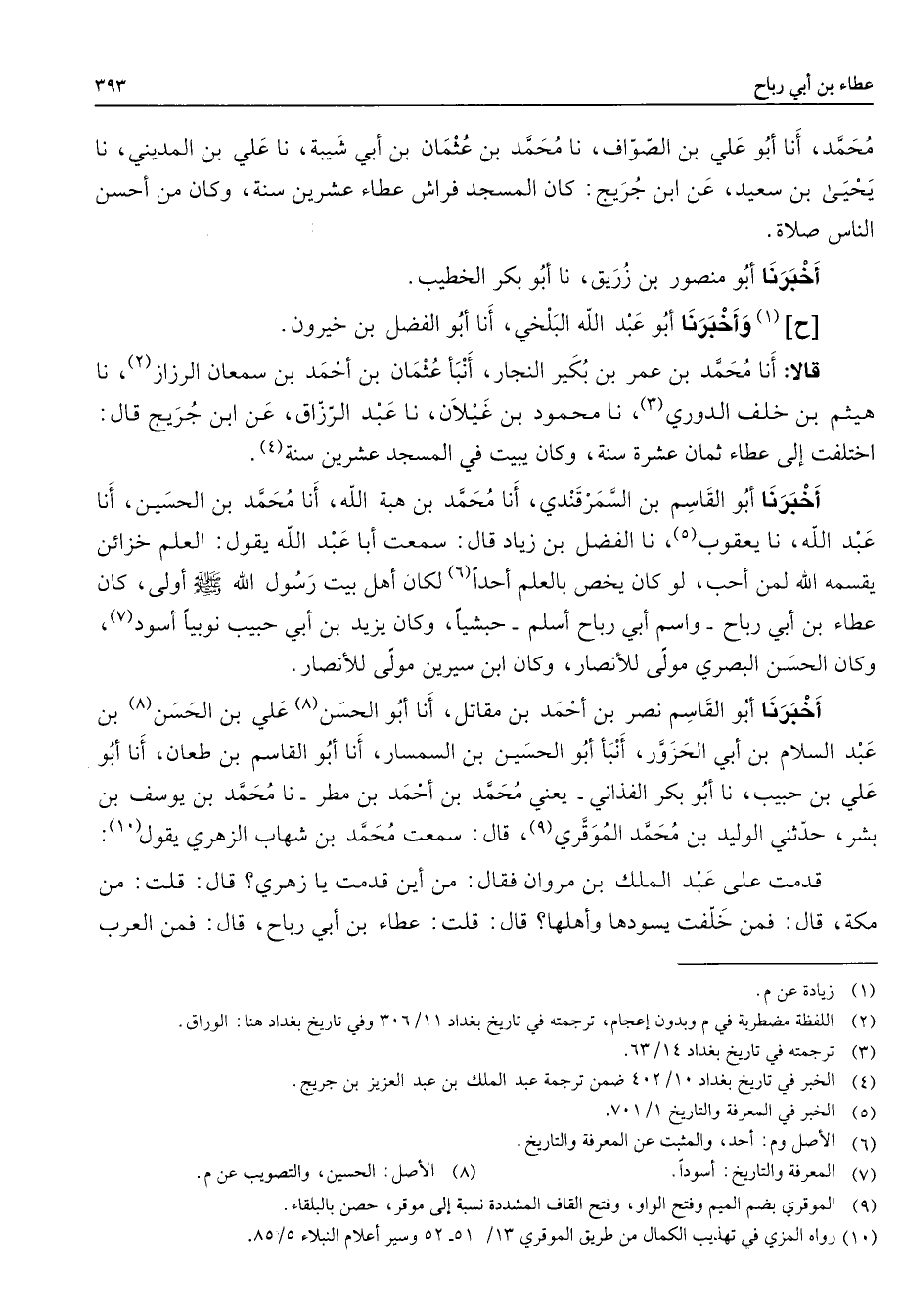 محمد أنا أبو علي بن الصواف نا محمد بن عثمان بن أبي شيبة نا علي بن المديني نا يحيى بن سعيد عن أبن جريج كان المسجد فراش عطاء عشرين سنة وكان من أحسن الناس صلاة أخبرنا أبو منصور بن زريق نا أبو بكر الخطيب ح (1) وأخبرنا أبو عبد الله البلخي أنا أبو الفضل بن خيرون قالا أنا محمد بن عمر بن بكير النجار أنبأ عثمان بن أحمد بن سمعان الرزاز (2) نا هيثم بن خلف الدوري (3) نا محمود بن غيلان نا عبد الرزاق عن ابن جريج قال اختلفت إلى عطاء ثمان عشرة سنة وكان يبيت في المسجد عشرين سنة (4) أخبرنا أبو القاسم بن السمرقندي أنا محمد بن هبة الله أنا محمد بن الحسين أنا عبد الله نا يعقوب (5) نا الفضل بن زياد قال سمعت أبا عبد الله يقول العلم خزائن يقسمه الله لمن أحب لو كان يخص بالعلم أحدا (6) لكان أهل بيت رسول الله (صلى الله عليه وسلم) أولى كان عطاء بن أبي رباح واسم أبي رباح أسلم حبشيا وكان يزيد بن أبي حبيب نوبيا أسود (7) ر وكان الحسن البصري مولى للأنصار وكان ابن سيرين مولى للأنصار أخبرنا أبو القاسم نصر بن أحمد بن مقاتل أنا أبو الحسن (8) علي بن الحسن (8) بن عبد السلام بن أبي الحزور أنبأ أبو الحسين بن السمسار أنا أبو القاسم بن طعان أنا أبو علي بن حبيب نا أبو بكر الفذاني يعني محمد بن أحمد بن مطر نا محمد بن يوسف بن بشر حدثني الوليد بن محمد الموقري (9) قال سمعت محمد بن شهاب الزهري يقول (10) قدمت على عبد الملك بن مروان فقال من أين قدمت يا زهري قال قلت من مكة قال فمن خلفت يسودها وأهلها قال قلت عطاء بن أبي رباح قال فمن العرب