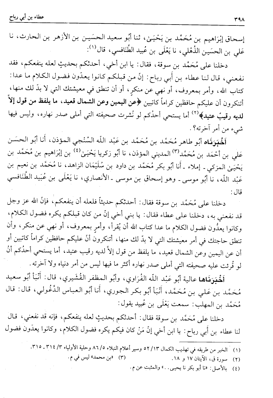 إسحاق إبراهيم بن محمد بن يحيى ثنا أبو سعيد الحسين بن الأزهر بن الحارث نا علي بن الحسين الذهلي نا يعلى بن عبيد الطنافسي قال (1) دخلنا على محمد بن سوقة فقال يا ابن أخي أحدثكم بحديث لعله ينفعكم فقد نفعني قال لنا عطاء بن أبي رباح إن من قبلكم كانوا يعدون فضول الكلام ما عدا كتاب الله وأمر بمعروف أو نهي عن منكر أو أن تنطق في معيشتك التي لا بد لك منها أتنكرون أن عليكم حافظين كراما كاتبين " عن اليمين وعن الشمال قعيد ما يلفظ من قول إلا لديه رقيب عتيد " (2) أما يستحي أحدكم لو نشرت صحيفته التي أملى صدر نهاره وليس فيها شئ من أمر آخرته أخبرناه أبو طاهر محمد بن محمد بن عبد الله السنجي المؤذن أنا أبو الحسن علي بن أحمد بن محمد (3) المديني المؤذن نا أبو زكريا يحيى (4) بن إبراهيم بن محمد بن يحيى المزكي إملاء أنا أبو بكر محمد بن داود بن سليمان الزاهد نا محمد بن نعيم بن عبد الله نا أبو موسى وهو إسحاق بن موسى الأنصاري نا يعلى بن عبيد الطنافسي قال دخلنا على محمد بن سوقة فقال أحدثكم حديثا فلعله أن ينفعكم فإن الله عز وجل قد نفعني به دخلنا على عطاء فقال يا بني أخي إن من كان قبلكم يكره فضول الكلام وكانوا يعدون فضول الكلام ما عدا كتاب الله أن يقرأ وأمر بمعروف أو نهي عن منكر وأن تنطق حاجتك في أمر معيشتك التي لا بد لك منها أتنكرون أن عليكم حافظين كراما كاتبين أو أن عن اليمين وعن الشمال قعيد ما يلفظ من قول إلا لديه رقيب عتيد أما يستحي أحدكم أن لو قرئت عليه صحيفته التي أملى صدر نهاره أكثر ما فيها ليس من أمر دنياه ولا آخرته أخبرناها عالية أبو عبد الله الفراوي وأبو المظفر القشيري قال أنبأ أبو سعيد محمد بن علي بن محمد أنبأ أبو بكر الجوري أنا أبو العباس الدغولي قال قال محمد بن المهلب سمعت يعلى بن عبيد يقول دخلنا على محمد بن سوقة فقال أحدثكم بحديث لعله ينفعكم فإنه قد نفعني قال لنا عطاء بن أبي رباح يا ابن أخي إن من كان فيكم يكره فضول الكلام وكانوا يعدون فضول