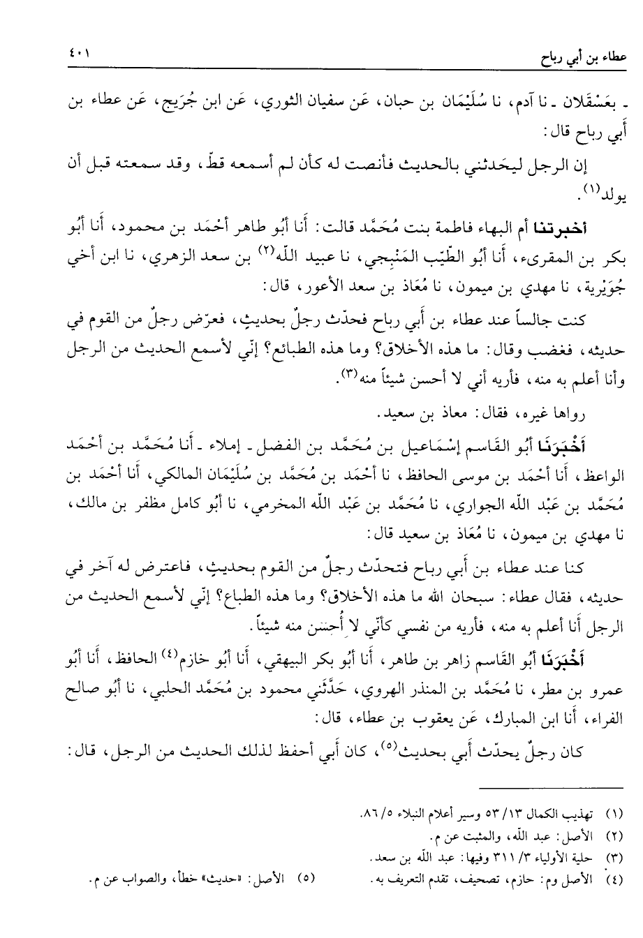 بعسقلان أنا آدم نا سليمان بن حبان عن سفيان الثوري عن ابن جريج عن عطاء بن أبي رباح قال إن الرجل ليحدثني بالحديث فأنصت له كأن لم أسمعه قط وقد سمعته قبل أن يولد (1) أخبرتنا أم البهاء فاطمة بنت محمد قالت أنا أبو طاهر أحمد بن محمود أنا أبو بكر بن المقرئ أنا أبو الطيب المنبجي نا عبيد الله (2) بن سعد الزهري نا ابن أخي جويرية نا مهدي بن ميمون نا معاذ بن سعد الأعور قال كنت جالسا عند عطاء بن أبي رباح فحدث رجل بحديث فعرض رجل من القوم في حديثه فغضب وقال ما هذه الأخلاق وما هذه الطبائع إني لأسمع الحديث من الرجل وأنا أعلم به منه فأريه أني لا أحسن شيئا منه (3) رواها غيره فقال معاذ بن سعيد أخبرنا أبو القاسم إسماعيل بن محمد بن الفضل إملاء أنا محمد بن أحمد الواعظ أنا أحمد بن موسى الحافظ نا أحمد بن محمد بن سليمان المالكي أنا أحمد بن محمد بن عبد الله الجواري نا محمد بن عبد الله المخرمي نا أبو كامل مظفر بن مالك نا مهدي بن ميمون نا معاذ بن سعيد قال كنا عند عطاء بن أبي رباح فتحدث رجل من القوم بحديث فاعترض له آخر في حديثه فقال عطاء سبحان الله ما هذه الأخلاق وما هذه الطباع إني لأسمع الحديث من الرجل أنا أعلم به منه فأريه من نفسي كأني لا أحسن منه شيئا أخبرنا أبو القاسم زاهر بن طاهر أنا أبو بكر البيهقي أنا أبو خازم (4) الحافظ أنا أبو عمرو بن مطر نا محمد بن المنذر الهروي حدثني محمود بن محمد الحلبي نا أبو صالح الفراء أنا ابن المبارك عن يعقوب بن عطاء قال كان رجل يحدث أبي بحديث (5) كان أبي أحفظ لذلك الحديث من الرجل قال
