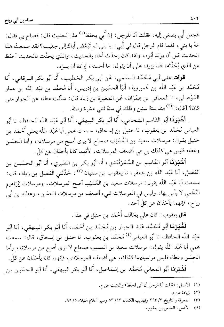 فجعل أبي يصغي إليه فقلت أنا للرجل إن أبي يحفظ (1) هذا الحديث قال فصاح بي فقال مه يا بني فلما قام الرجل قال لي أبي يا بني لم تبغض أباك إلى جليسه لقد سمعت هذا الحديث قبل أن يولد أبوه ولقد كان يحدث أخاه بالحديث والذي يحدث بالحديث أحفظ من الذي يحدثه فما يزيده على أن يقول ما أحسنه إرادة أن يسره قرأت على أبي محمد السلمي عن أبي بكر الخطيب أنا أبو بكر البرقاني أنا محمد بن عبد الله بن خميروية أنبأ الحسين بن إدريس أنا محمد بن عبد الله بن عمار الموصلي أنا المعافى بن عمران عن المغيرة بن زياد قال سألت عطاء عن الجوار متى كان قال (2) منذ ستة سنين وذلك في سنة ثنتي عشرة ومائة أخبرنا أبو القاسم الشحامي أنا أبو بكر البيهقي أنا أبو عبد الله الحافظ نا أبو العباس محمد بن يعقوب نا حنبل بن إسحاق سمعت عمي أبا عبد الله يعني أحمد بن حنبل يقول مرسلات سعيد بن المسيب صحاح لا يرى أصح من مرسلاته وأما الحسن وعطا فليس هي كذلك بل هي أضعف المرسلات لأنهما كانا يأخذان عن كل أخبرنا أبو القاسم بن السمرقندي أنا أبو بكر بن الطبري أنا أبو الحسين بن الفضل أنا عبد الله بن جعفر نا يعقوب بن سفيان (3) حدثني الفضل بن زياد قال سمعت أبا عبد الله يقول مرسلات سعيد بن المسيب أصح المرسلات ومرسلات إبراهيم النخعي لا بأس بها وليس في المرسلات شئ أضعف من مرسلات الحسن وعطاء بن أبي رباح فإنهما يأخذان عن كل أحد قال يعقوب كان علي يخالف أحمد بن حنبل في هذا أخبرنا أبو محمد عبد الجبار بن محمد بن أحمد أنا أبو بكر البيهقي أنا أبو عبد الله الحافظ نا أبو العباس (4) محمد بن يعقوب نا حنبل بن إسحاق قال سمعت عمي أبا عبد الله يقول مرسلات سعيد بن المسيب صحاح لا نرى أصح من مرسلاته وأما الحسن وعطاء فليس مراسليهما كذلك هي أضعف المرسلات فإنهما كانا يأخذان عن كل أخبرنا أبو المعالي محمد بن إسماعيل أنا أبو بكر البيهقي أنا أبو الحسين بن