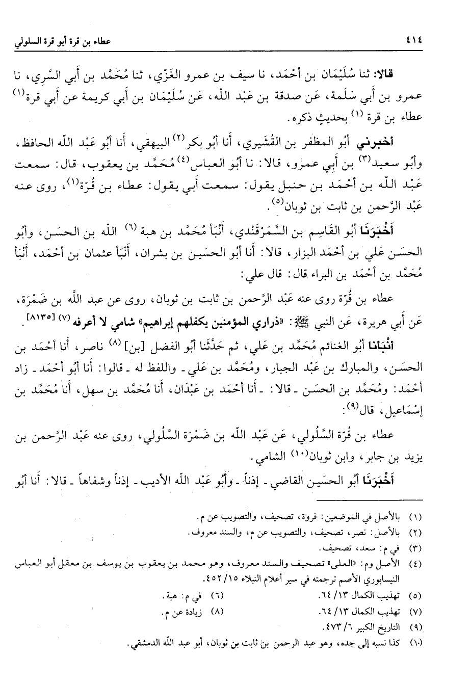 قالا ثنا سليمان بن أحمد نا سيف بن عمرو الغزي ثنا محمد بن أبي السري نا عمرو بن أبي سلمة عن صدقة بن عبد الله عن سليمان بن أبي كريمة عن أبي قرة (1) عطاء بن قرة (1) بحديث ذكره أخبرني أبو المظفر بن القشيري أنا أبو بكر (2) البيهقي أنا أبو عبد الله الحافظ وأبو سعيد (3) بن أبي عمرو قالا نا أبو العباس (4) محمد بن يعقوب قال سمعت عبد الله بن أحمد بن حنبل يقول سمعت أبي يقول عطاء بن قرة (1) روى عنه عبد الرحمن بن ثابت بن ثوبان (5) أخبرنا أبو القاسم بن السمرقندي أنبأ محمد بن هبة (6) الله بن الحسن وأبو الحسن علي بن أحمد البزار قالا أنا أبو الحسين بن بشران أنبأ عثمان بن أحمد أنبأ محمد بن أحمد بن البراء قال قال علي عطاء بن قرة روى عنه عبد الرحمن بن ثابت بن ثوبان روى عن عبد الله بن ضمرة عن أبي هريرة عن النبي (صلى الله عليه وسلم) ذراري المؤمنين يكفلهم إبراهيم شامي لا أعرفه (7)