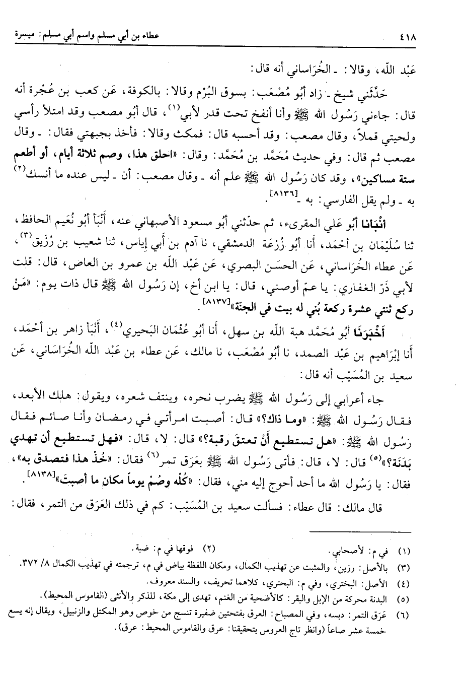 عبد الله وقالا الخراساني أنه قال حدثني شيخ زاد أبو مصعب بسوق البرم وقالا بالكوفة عن كعب بن عجرة أنه قال جاءني رسول الله (صلى الله عليه وسلم) وأنا أنفخ تحت قدر لأبي (1) قال أبو مصعب وقد امتلأ رأسي ولحيتي قملا وقال مصعب وقد أحسبه قال فمكث وقالا فأخذ بجبهتي فقال وقال مصعب ثم قال وفي حديث محمد بن محمد وقال احلق هذا وصم ثلاثة أيام أو أطعم ستة مساكين وقد كان رسول الله (صلى الله عليه وسلم) علم أنه وقال مصعب أن ليس عنده ما أنسك (2) به ولم يقل الفارسي به