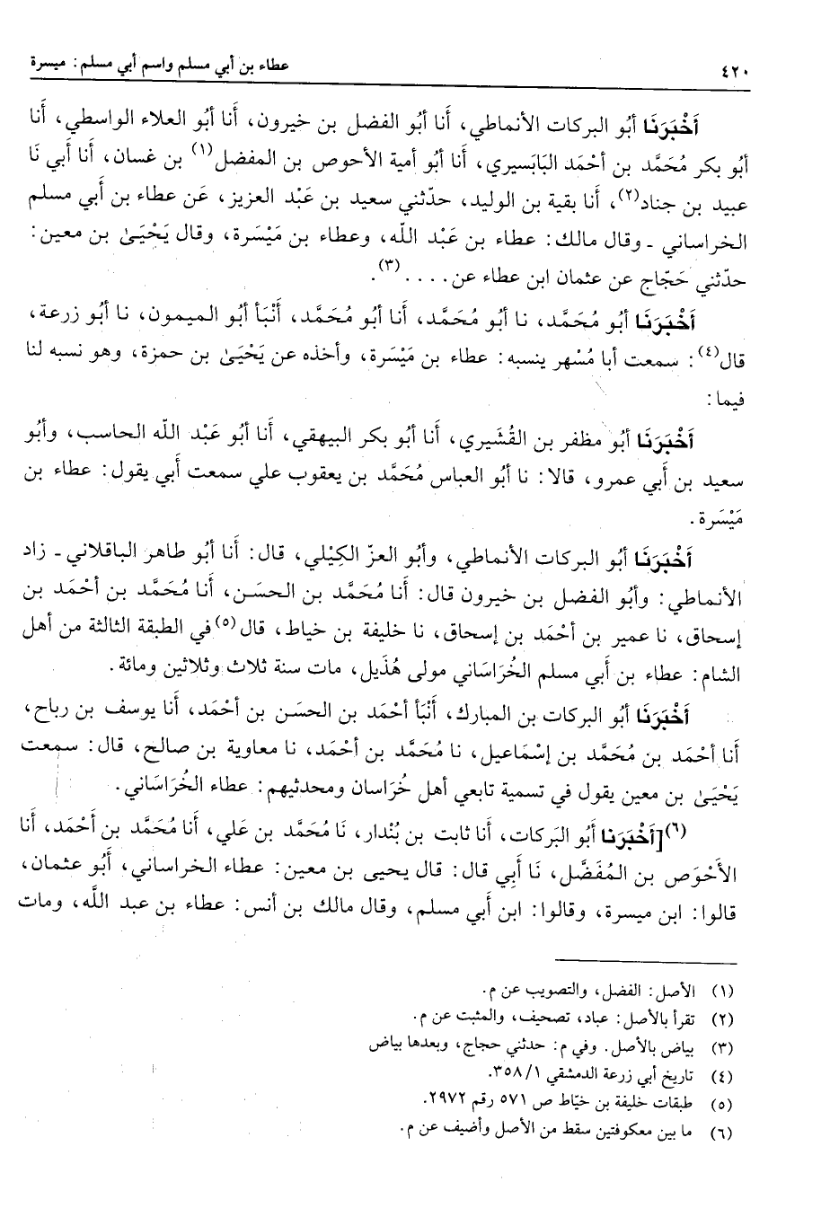 (3) أخبرنا أبو محمد نا أبو محمد أنا أبو محمد أنبأ أبو الميمون نا أبو زرعة قال (4) سمعت أبا مسهر ينسبه عطاء بن ميسرة وأخذه عن يحيى بن حمزة وهو نسبه لنا فيما أخبرنا أبو مظفر بن القشيري أنا أبو بكر البيهقي أنا أبو عبد الله الحاسب وأبو سعيد بن أبي عمرو قالا نا أبو العباس محمد بن يعقوب علي سمعت أبي يقول عطاء بن ميسرة أخبرنا أبو البركات الأنماطي وأبو العز الكيلي قال أنا أبو طاهر الباقلاني زاد الأنماطي وأبو الفضل بن خيرون قال أنا محمد بن الحسن أنا محمد بن أحمد بن إسحاق أنا عمير بن أحمد بن إسحاق أنا خليفة بن خياط قال (5) في الطبقة الثالثة من أهل الشام عطاء بن أبي مسلم الخراساني مولى هذيل مات سنة ثلاث وثلاثين ومائة أخبرنا أبو البركات بن المبارك أنبأ أحمد بن الحسن بن أحمد أنا يوسف بن رباح أنا أحمد بن محمد بن إسماعيل نا محمد بن أحمد نا معاوية بن صالح قال سمعت يحيى بن معين يقول في تسمية تابعي أهل خراسان ومحدثيهم عطاء الخراساني (6) أخبرنا أبو البركات أنا ثابت بن بندار نا محمد بن علي أنا محمد بن أحمد أنا الأحوص بن المفضل نا أبي قال قال يحيى بن معين عطاء الخراساني أبو عثمان قالوا ابن ميسرة وقالوا ابن أبي مسلم وقال مالك بن أنس عطاء بن عبد الله ومات