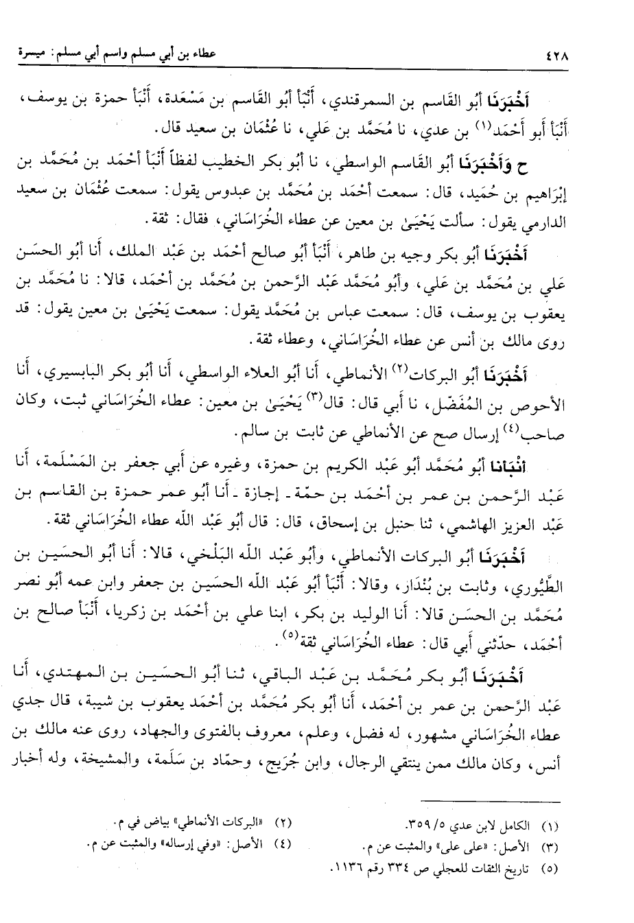 أخبرنا أبو القاسم بن السمرقندي أنبأ أبو القاسم بن مسعدة أنبأ حمزة بن يوسف أنبأ أبو أحمد (1) بن عدي نا محمد بن علي نا عثمان بن سعيد قال ح وأخبرنا أبو القاسم الواسطي نا أبو بكر الخطيب لفظا أنبأ أحمد بن محمد بن إبراهيم بن حميد قال سمعت أحمد بن محمد بن عبدوس يقول سمعت عثمان بن سعيد الدارمي يقول سألت يحيى بن معين عن عطاء الخراساني فقال ثقة أخبرنا أبو بكر وجيه بن طاهر أنبأ أبو صالح أحمد بن عبد الملك أنا أبو الحسن علي بن محمد بن علي وأبو محمد عبد الرحمن بن محمد بن أحمد قالا نا محمد بن يعقوب بن يوسف قال سمعت عباس بن محمد يقول سمعت يحيى بن معين يقول قد روى مالك بن أنس عن عطاء الخراساني وعطاء ثقة أخبرنا أبو البركات (2) الأنماطي أنا أبو العلاء الواسطي أنا أبو بكر البابسيري أنا الأحوص بن المفضل نا أبي قال قال (3) يحيى بن معين عطاء الخراساني ثبت وكان صاحب (4) إرسال صح عن الأنماطي عن ثابت بن سالم أنبأنا أبو محمد أبو عبد الكريم بن حمزة وغيره عن أبي جعفر بن المسلمة أنا عبد الرحمن بن عمر بن أحمد بن حمة إجازة أنا أبو عمر حمزة بن القاسم بن عبد العزيز الهاشمي ثنا حنبل بن إسحاق قال قال أبو عبد الله عطاء الخراساني ثقة أخبرنا أبو البركات الأنماطي وأبو عبد الله البلخي قالا أنا أبو الحسين بن الطيوري وثابت بن بندار وقالا أنبأ أبو عبد الله الحسين بن جعفر وابن عمه أبو نصر محمد بن الحسن قالا أنا الوليد بن بكر ابنا علي بن أحمد بن زكريا أنبأ صالح بن أحمد حدثني أبي قال عطاء الخراساني ثقة (5) أخبرنا أبو بكر محمد بن عبد الباقي ثنا أبو الحسين بن المهتدي أنا عبد الرحمن بن عمر بن أحمد أنا أبو بكر محمد بن أحمد بن يعقوب شيبة قال جدي عطاء الخراساني مشهور له فضل وعلم معروف بالفتوى والجهاد روى عنه مالك بن أنس وكان مالك ممن ينتقي الرجال وابن جريج وحماد بن سلمة والمشيخة وله أخبار