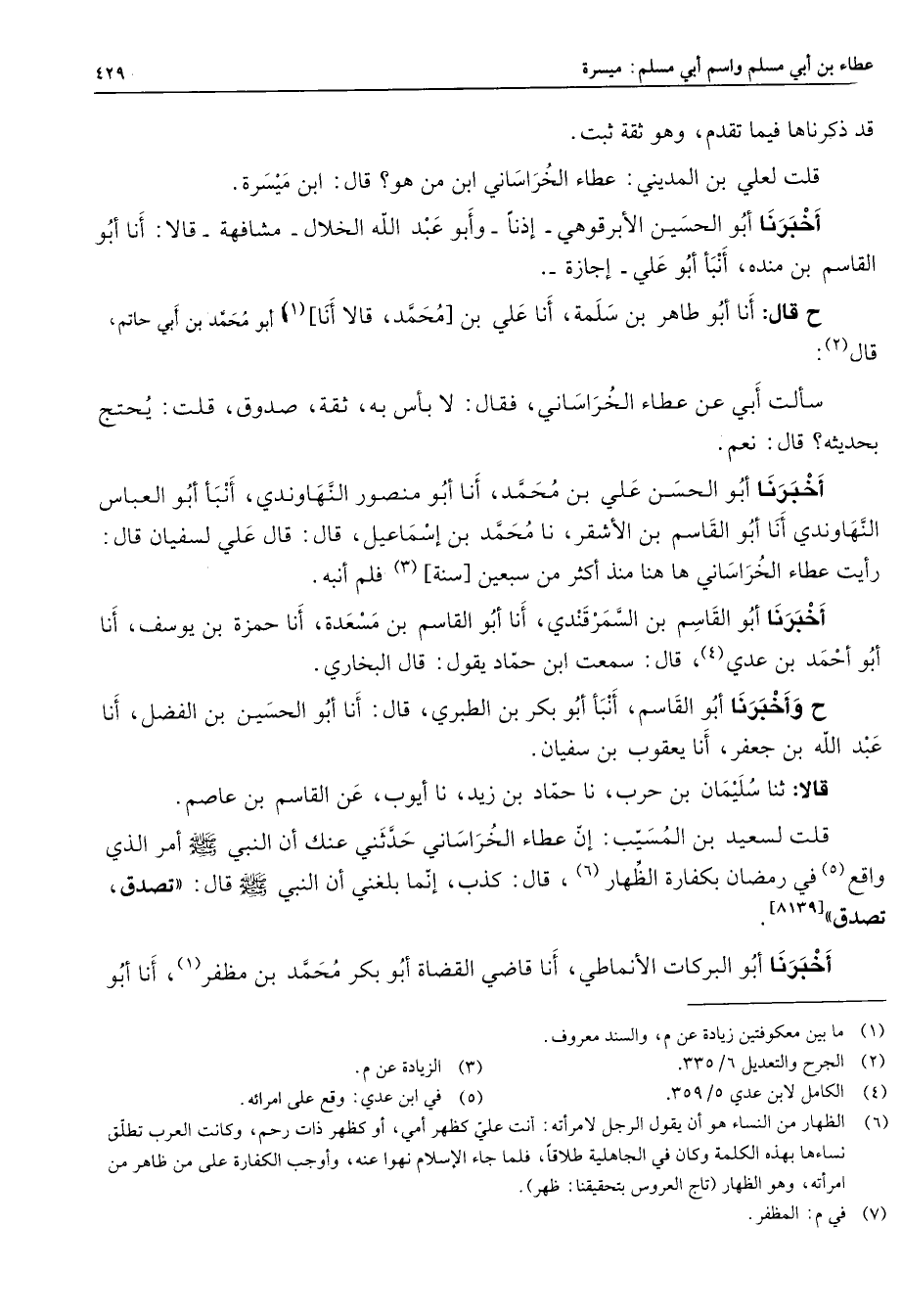 قد ذكرناها فيما تقدم وهو ثقة ثبت قلت لعلي بن المديني عطاء الخراساني ابن من هو قال ابن ميسرة أخبرنا أبو الحسين الأبرقوهي إذنا وأبو عبد الله الخلال مشافهة قالا أنا أبو القاسم بن منده أنبأ أبو علي إجازة ح قال أنا أبو طاهر بن سلمة أنا علي بن محمد قالا أنا (1) أبو محمد بن أبي حاتم قال (2) سألت أبي عن عطاء الخراساني فقال لا بأس به ثقة صدوق قلت يحتج بحديثه قال نعم أخبرنا أبو الحسن علي بن محمد أنا أبو منصور النهاوندي أنبأ أبو العباس النهاوندي أنا أبو القاسم بن الأشقر نا محمد بن إسماعيل قال قال علي لسفيان قال رأيت عطاء الخراساني ها هنا منذ أكثر من سبعين سنة (3) فلم أنبه أخبرنا أبو القاسم بن السمرقندي أنا أبو القاسم بن مسعدة أنا حمزة بن يوسف أنا أبو أحمد بن عدي (4) قال سمعت ابن حماد يقول قال البخاري ح وأخبرنا أبو القاسم أنبأ أبو بكر بن الطبري قال أنا أبو الحسين بن الفضل أنا عبد الله بن جعفر أنا يعقوب بن سفيان قالا ثنا سليمان بن حرب نا حماد بن زيد نا أيوب عن القاسم بن عاصم قلت لسعيد بن المسيب إن عطاء الخراساني حدثني عنك أن النبي (صلى الله عليه وسلم) أمر الذي واقع (5) في رمضان بكفارة الظهار (6) قال كذب إنما بلغني أن النبي (صلى الله عليه وسلم) قال تصدق تصدق