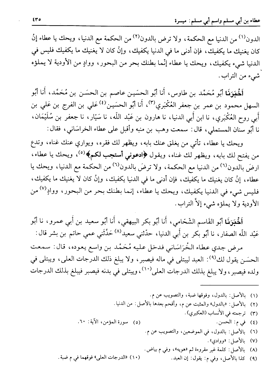الدون (1) من الدنيا مع الحكمة ولا ترض بالدون (2) من الحكمة مع الدنيا ويحك يا عطاء إن كان يغنيك ما يكفيك فإن أدنى ما في الدينا يكفيك وإن كان لا يغنيك ما يكفيك فليس في الدنيا شئ يكفيك ويحك يا عطاء إنما بطنك بحر من البحور وواد من الأودية لا يملؤه شئ من التراب أخبرنا أبو محمد بن طاوس أنا أبو الحسين عاصم بن الحسن بن محمد أنا أبو السهل محمود بن عمر بن جعفر العكبري (3) أنا أبو الحسين (4) علي بن الفرج بن علي بن أبي روح العكبري نا ابن أبي الدنيا نا هارون بن عبد الله نا سيار نا جعفر بن سليمان نا أبو سنان المستملي قال سمعت وهب بن منبه وأقبل على عطاء الخراساني فقال ويحك يا عطاء تأتي من يغلق عنك بابه ويظهر لك فقره ويواري عنك غناه وتدع من يفتح لك بابه ويظهر لك غناه ويقول " ادعوني أستجب لكم " (5) ويحك يا عطاء ارض بالدون من الدنيا مع الحكمة ولا ترض بالدون (6) من الحكمة مع الدنيا ويحك يا عطاء إن كان يغنيك ما يكفيك فإن أدنى ما في الدنيا يكفيك وإن كان لا يغنيك ما يكفيك فليس شئ في الدنيا يكفيك ويحك يا عطاء إنما بطنك بحر من البحور وواد (7) من الأودية ولا يملؤه شئ إلا التراب أخبرنا أبو القاسم الشحامي أنا أبو بكر البيهقي أنا أبو سعيد بن أبي عمرو نا أبو عبد الله الصفار نا بو بكر بن أبي الدنيا حدثني سعيد (8) حدثني عمي حاتم بن بشر قال مرض جدي عطاء الخراساني فدخل عليه محمد بن واسع يعوده قال سمعت الحسن يقول لك العبد ليبتلى في ماله فيصبر ولا يبلغ ذلك الدرجات العلى ويبتلي في ولده فيصبر ولا يبلغ بذلك الدرجات العلى (10) ويبتلي في بدنه فيصبر فيبلغ بذلك الدرجات