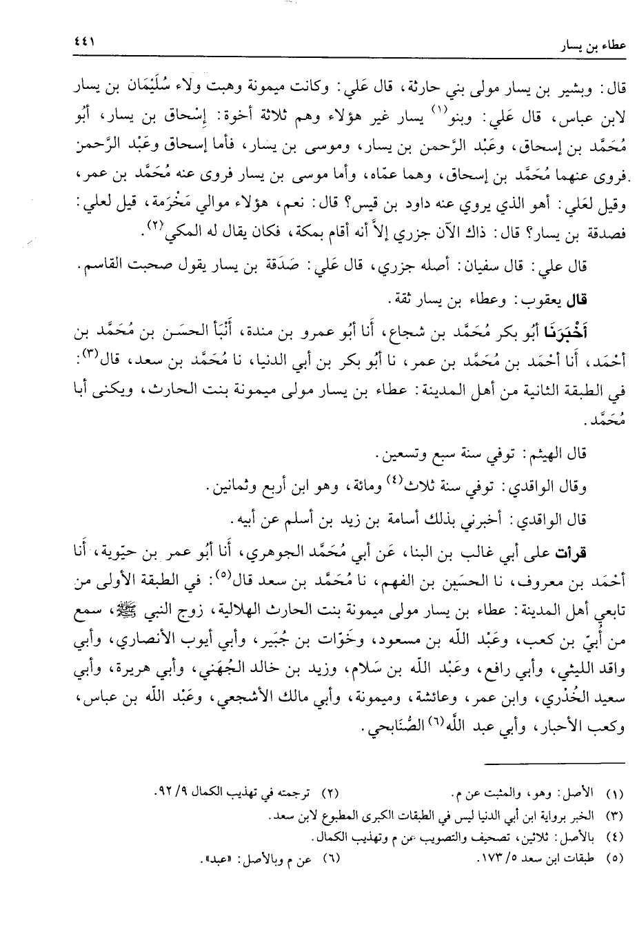 قال وبشير بن يسار مولى بني حارثة قال علي وكانت ميمونة وهبت ولاء سليمان بن يسار لابن عباس قال علي وبنو (1) يسار غير هؤلاء وهم ثلاثة إخوة إسحاق بن يسار أبو محمد بن إسحاق وعبد الرحمن بن يسار وموسى بن يسار فأما إسحاق وعبد الرحمن فروي عنهما محمد بن إسحاق وهما عماه وأما موسى بن يسار فروى عنه محمد بن عمر وقيل لعلي أهو الذي يروي عنه داود بن قيس قال نعم هؤلاء موالي مخرمة قيل لعلي فصدقة بن يسار قال ذاك الآن جزري إلا أنه أقام بمكة فكان يقال له المكي (2) قال علي قال سفيان أصله جزري قال علي صدقة بن يسار يقول صحبت القاسم قال يعقوب وعطاء بن يسار ثقة أخبرنا أبو بكر محمد بن شجاع أنا أبو عمرو بن مندة أنبأ الحسن بن محمد بن أحمد أنا أحمد بن محمد بن عمر نا أبو بكر بن أبي الدنيا نا محمد بن سعد قال (3) في الطبقة الثانية من أهل المدينة عطاء بن يسار مولى ميمونة بنت الحارث ويكنى أبا محمد قال الهيثم توفى سنة سبع وتسعين وقال الواقدي توفى سنة ثلاث (4) ومائة وهو ابن أربع وثمانين قالى الواقدي أخبرني بذلك اسامة بن زيد بن أسلم عن ابيه قرأت على ابي غالب بن البنا عن أبي محمد الجوهري أنا أبو عمر بن حيوية أنا أحمد بن معروف نا الحسين بن الفهم نا محمد بن سعد قال (5) في الطبقة الأولى من تابعي أهل المدينة عطاء بن يسار مولى ميمونة بنت الحارث الهلالية زوج النبي (صلى الله عليه وسلم) سمع من أبي بن كعب وعبد الله بن مسعود وخوات بن جبير وأبي أيوب الأنصاري وأبي واقد الليثي وابي رافع وعبد الله بن سلام وزيد بن خالد الجهني وأبي هريرة وأبي سعيد الخدري وابن عمر وعائشة وميمونة وأبي مالك الأشجعي وعبد الله بن عباس وكعب الأحبار وأبي عبد الله (6) الصنابحي